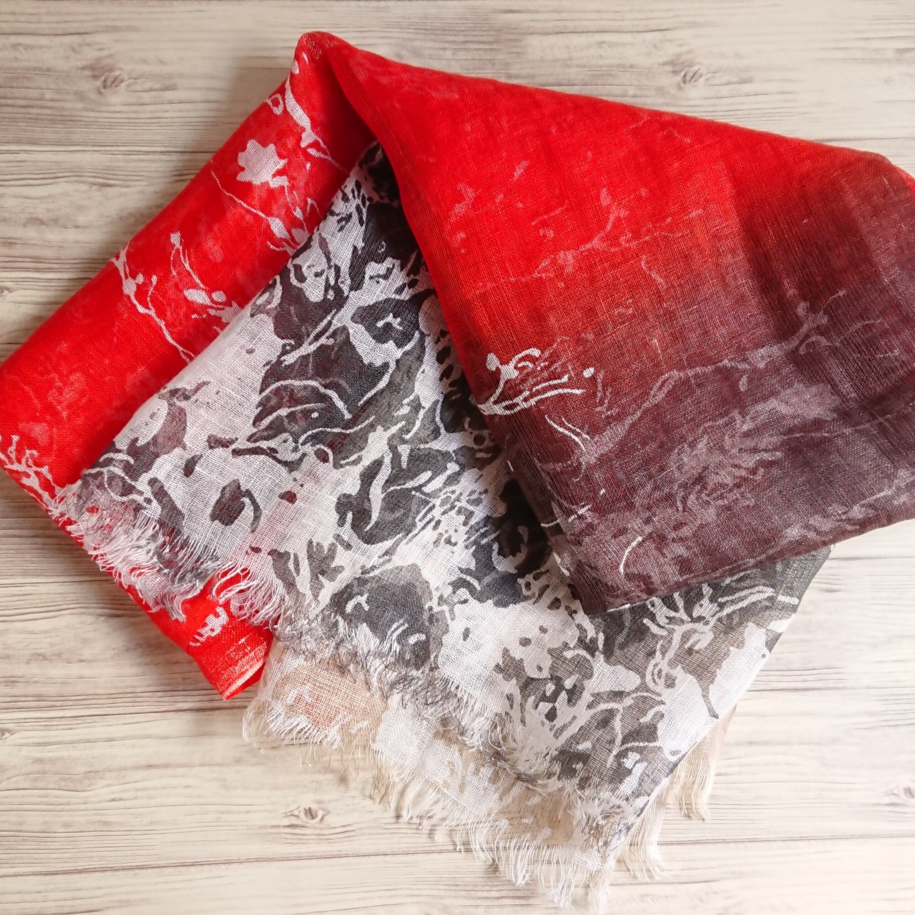 PASHMAブランドの《スカーレットとアースカラーのリネンストール》。薄手のリネンを使用し、肌に心地よく馴染む仕上がりが魅力です。鮮やかな朱赤とベージュブラウンの美しいコントラストは、どんなコーディネートにも映えるアイテムです。植物のシルエットが白抜きで表現されたデザインです。