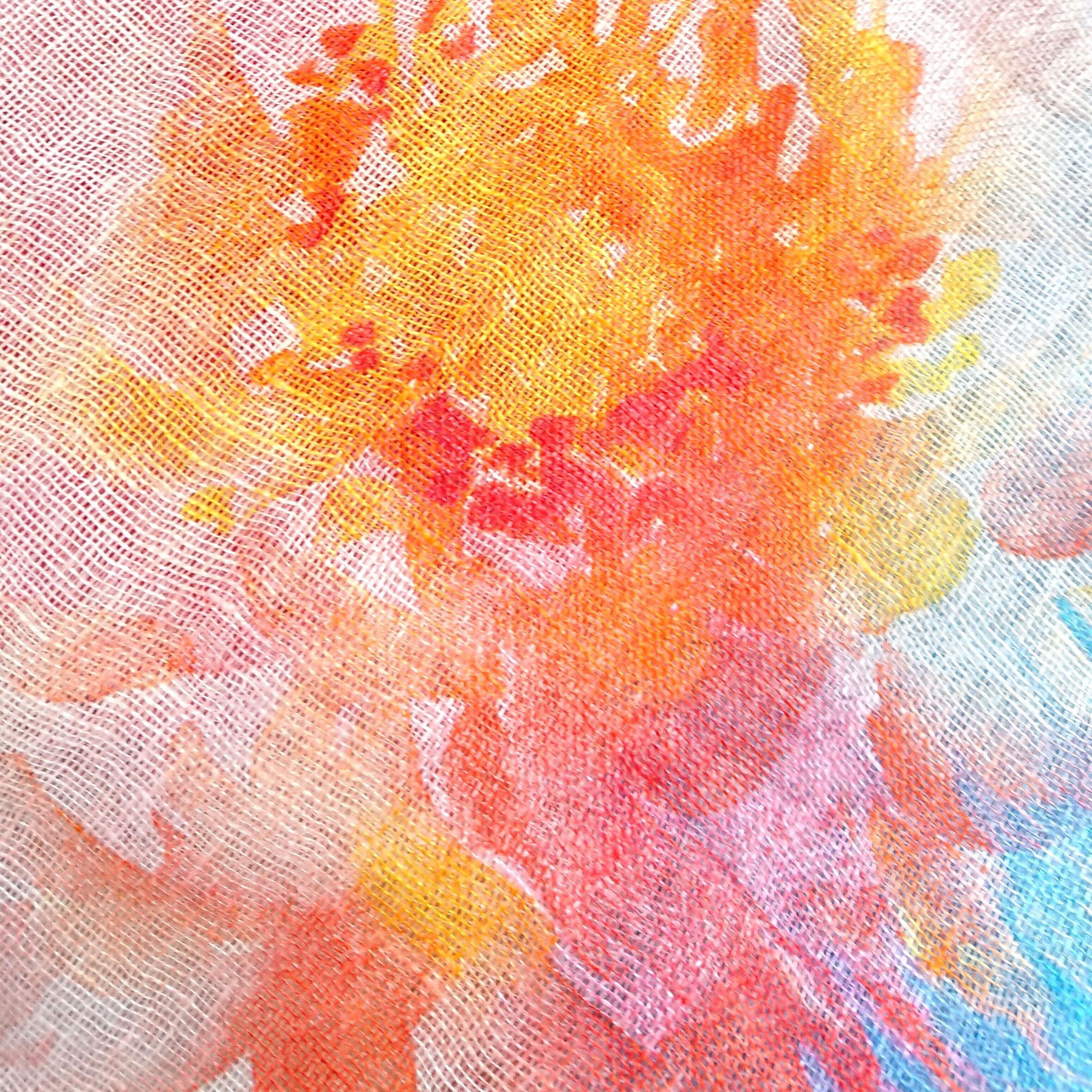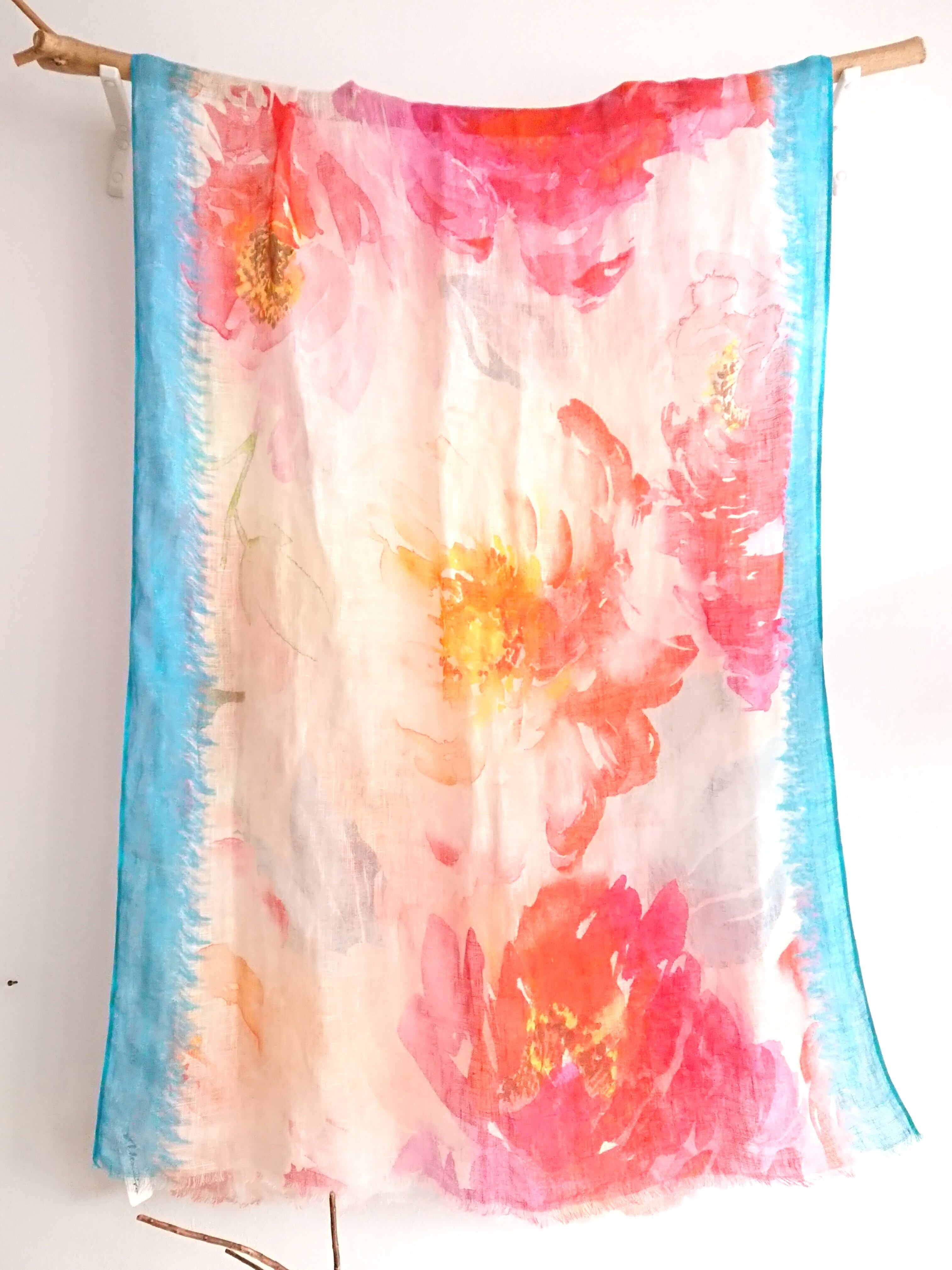 明るい色彩の大きな赤い花が印象的なリネンストールです。