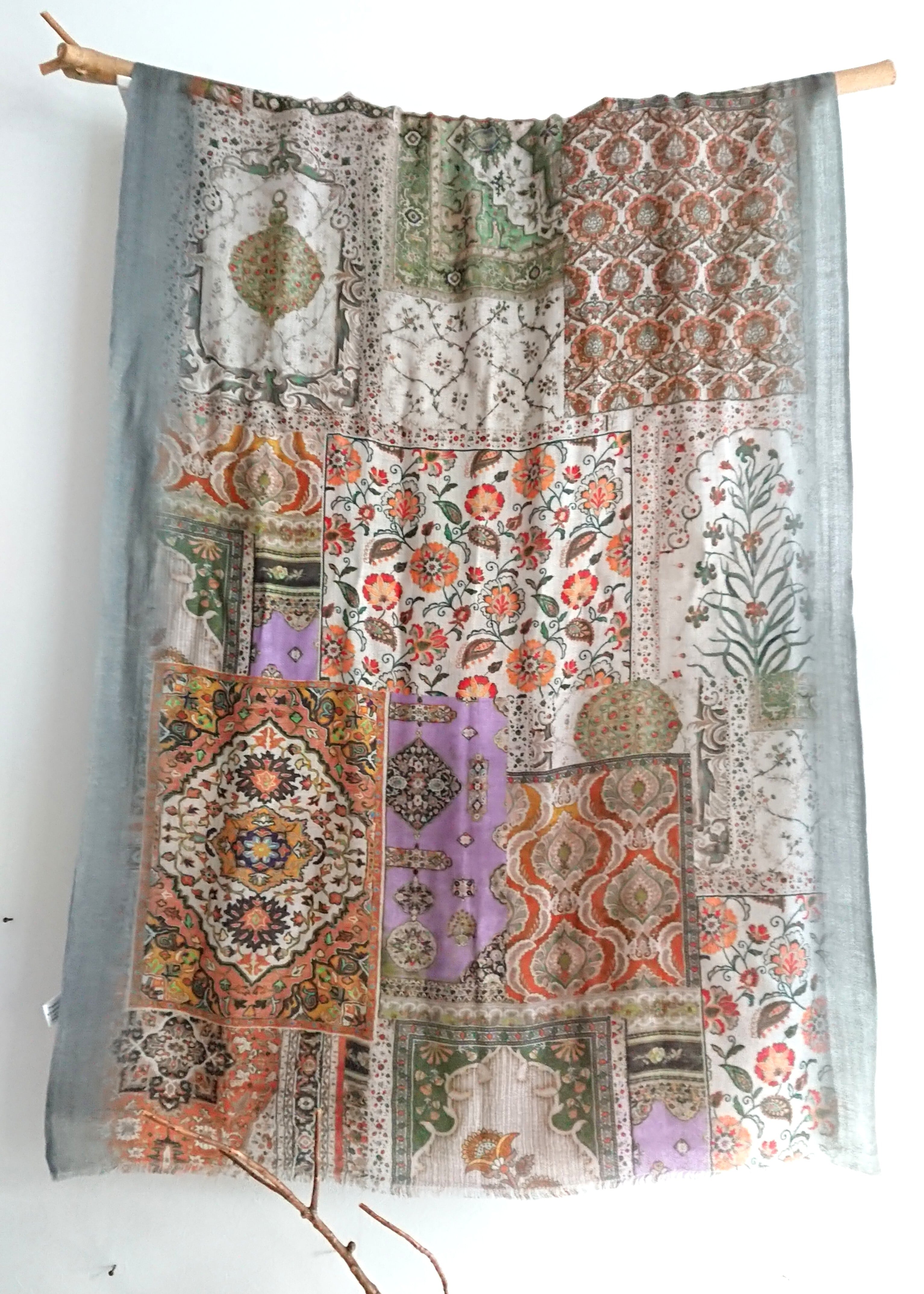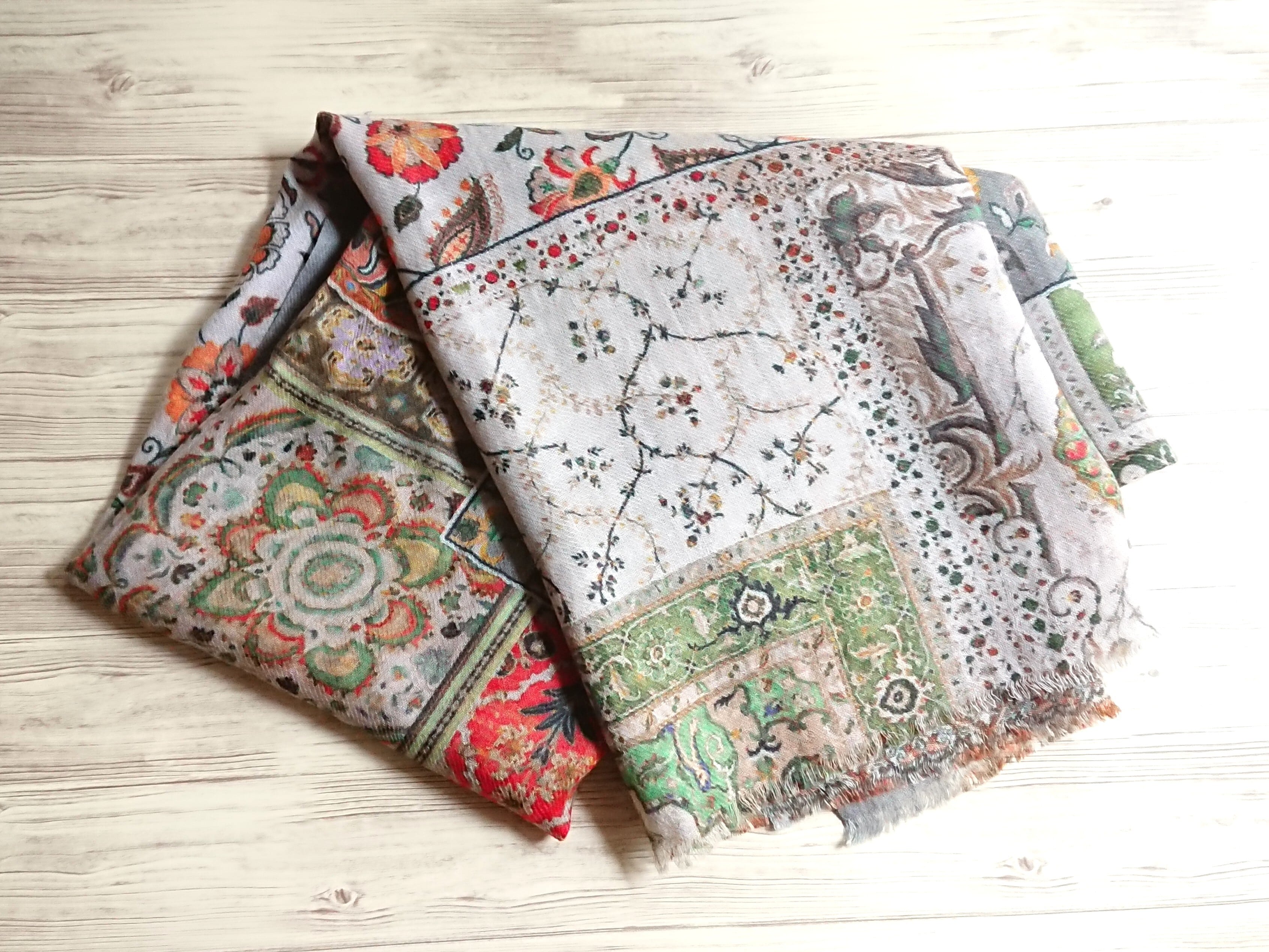 ヴィンテージエスニックの花柄が魅力のこのストールは、肌に優しく馴染むウール90%・シルク10%の薄手素材が特徴です。レトロなタイルのようなフラワー柄が、たくさん並んでいるデザインはどこか懐かしさを感じさせ、かわいらしさを引き立てます。