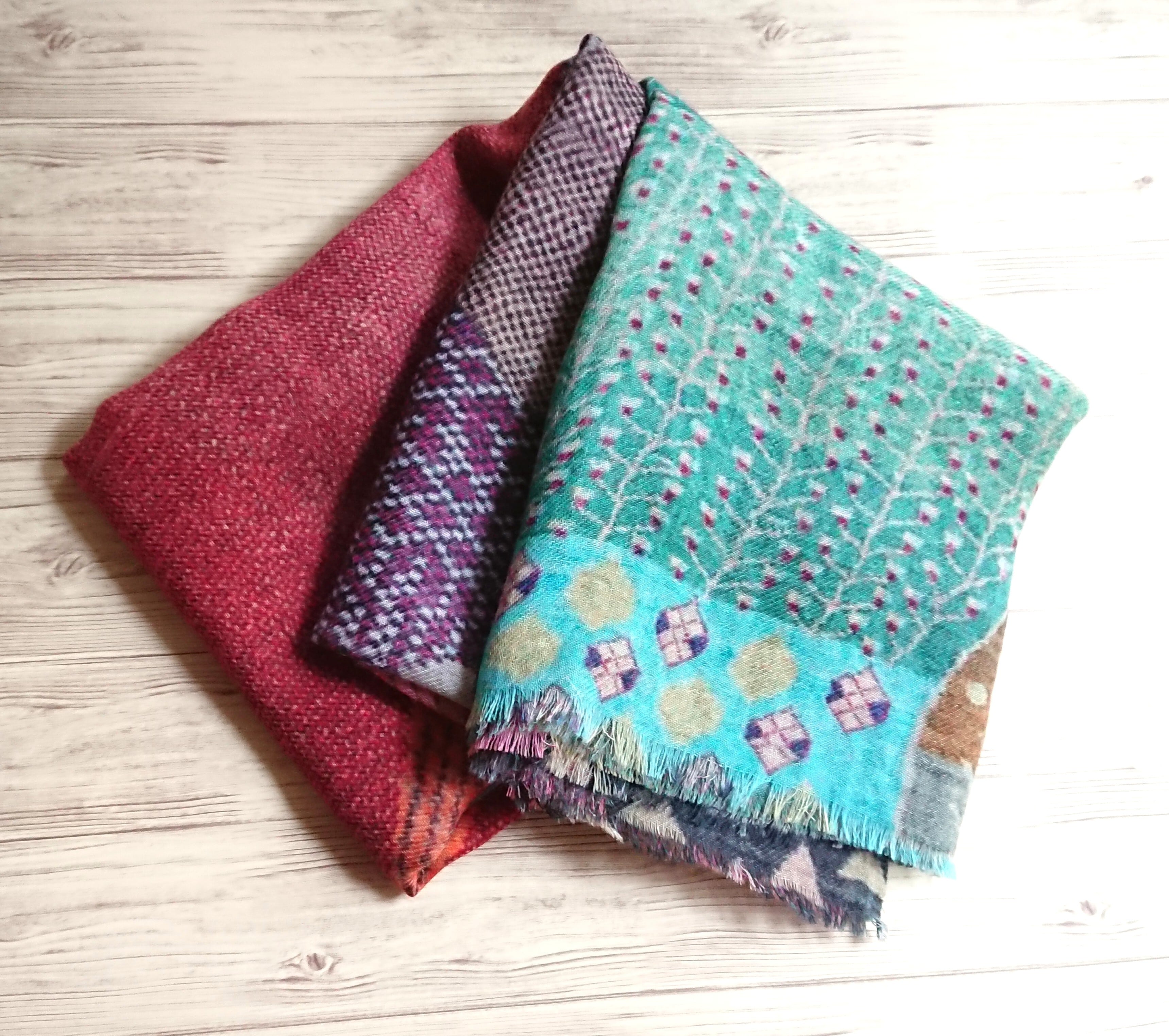 幾何学模様の不思議なプリントが施された薄手のウールストールは、その独特なデザインが特徴です。個性的なパターンと鮮やかな色合いが、一瞬でコーディネートにアクセントを加え、どんなシーンでも目を引く存在感を放ちます。