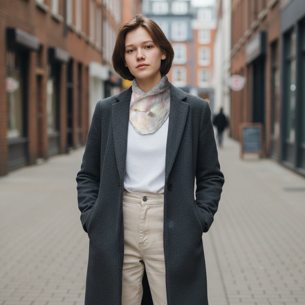 コートの襟元に小さくワンポイントでコンパクトに収まります。