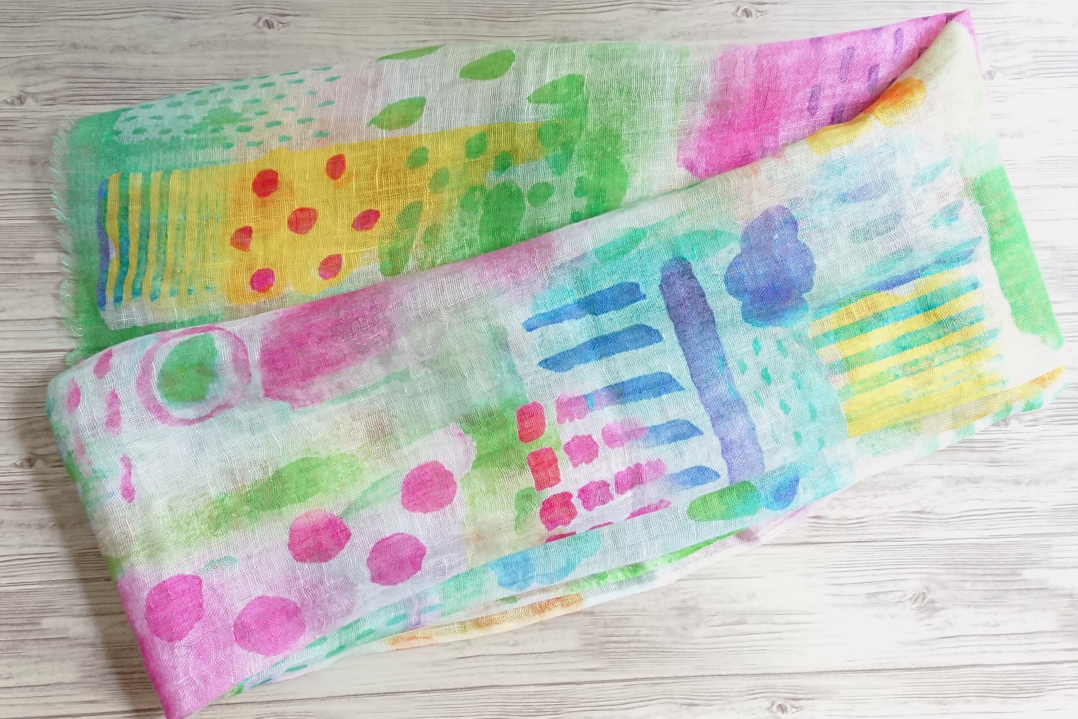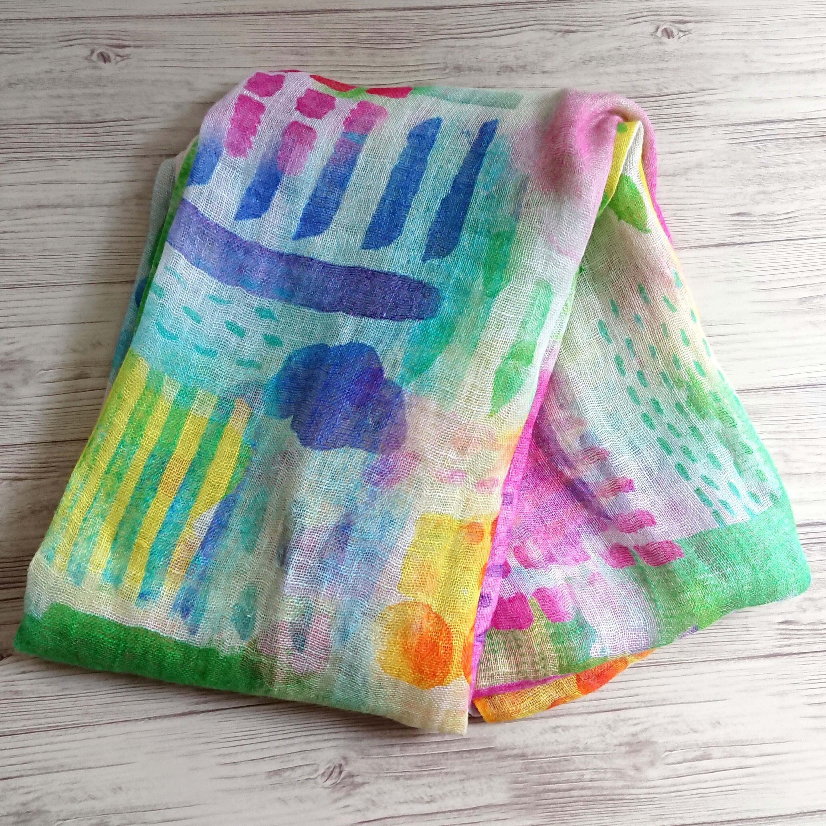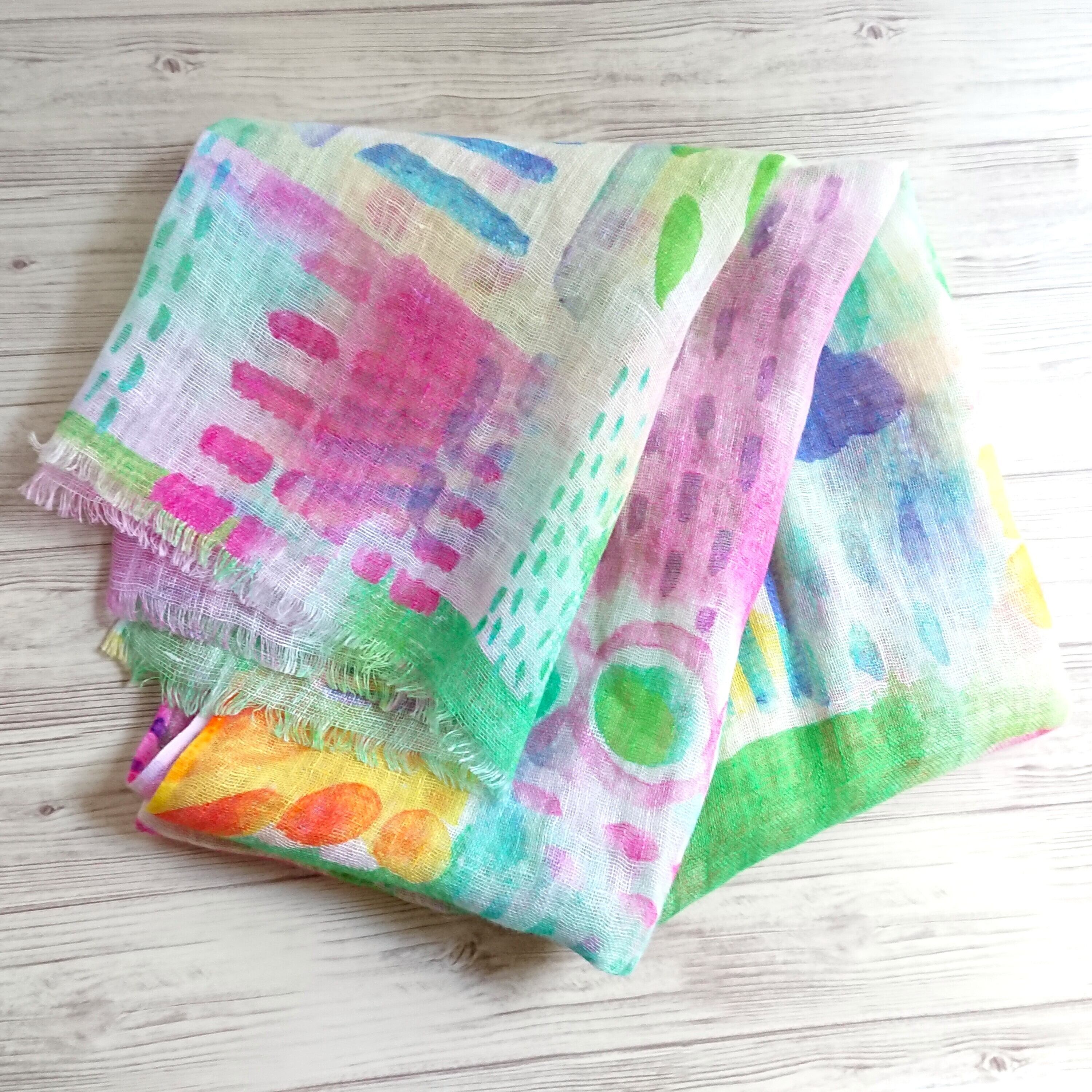 絵の具で春を表現したような、ペイント風の絵柄が楽しいリネンストールです。