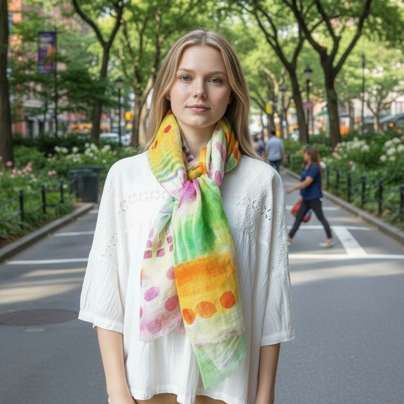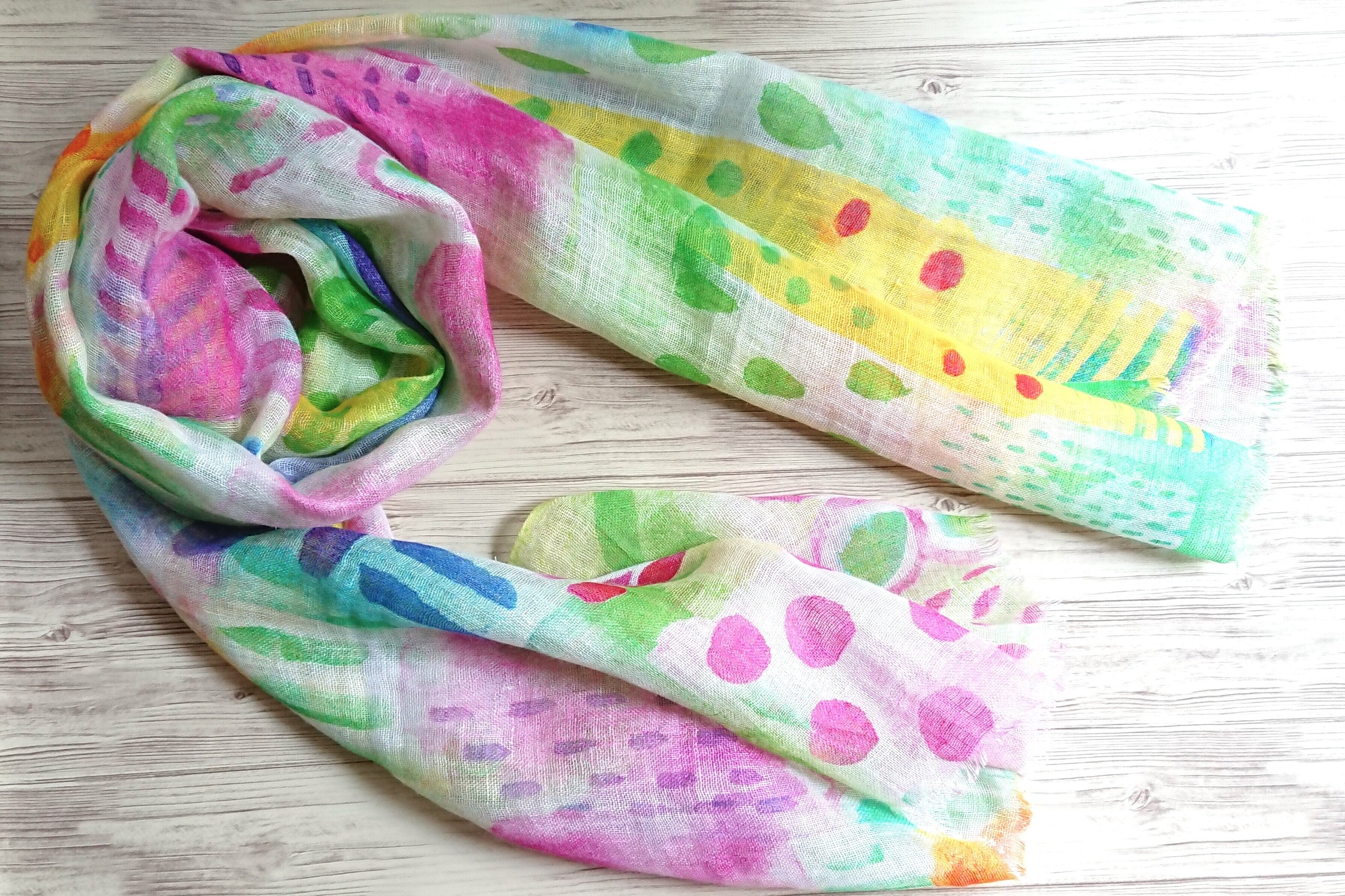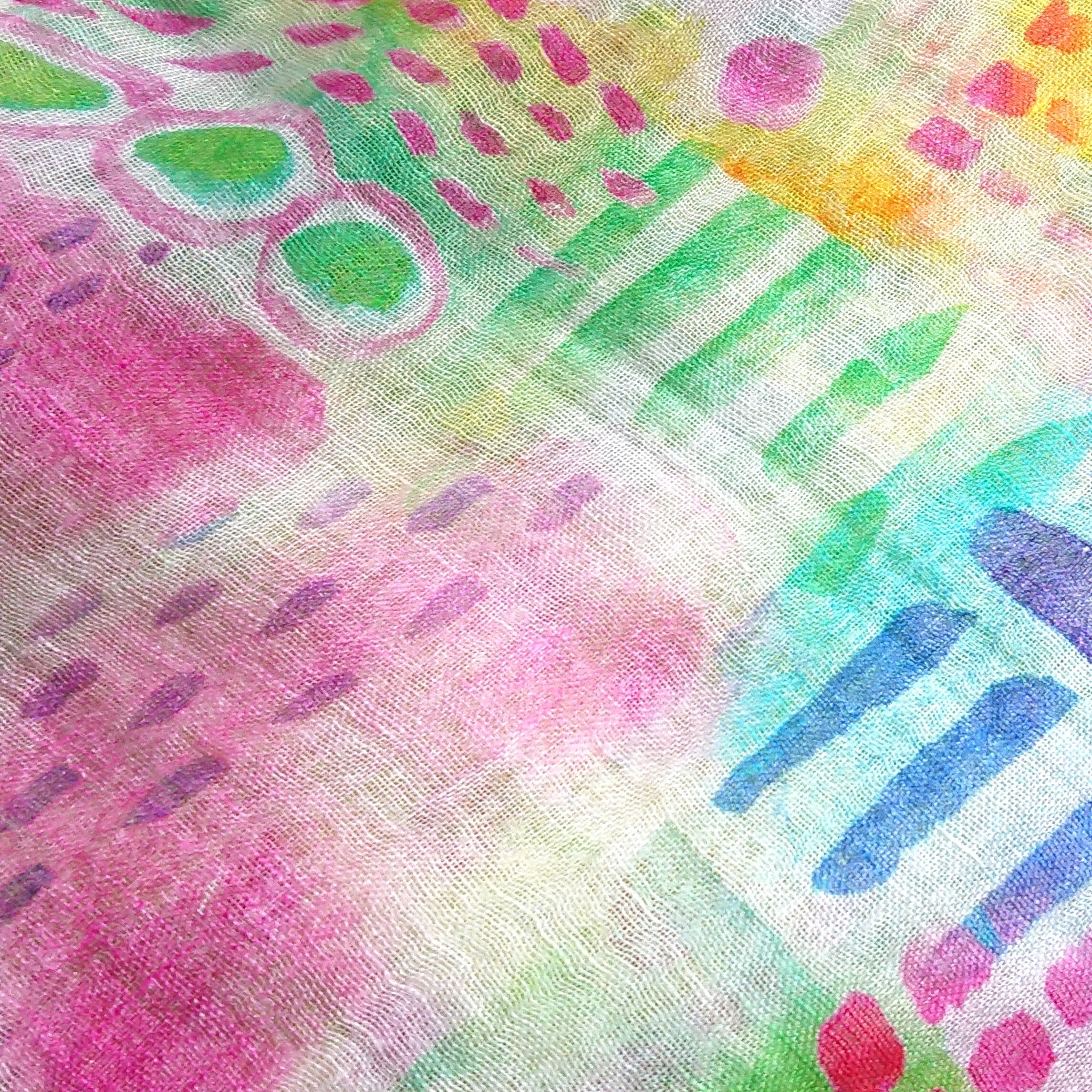 絵の具で春を表現したような、ペイント風の絵柄が楽しいリネンストールです。
