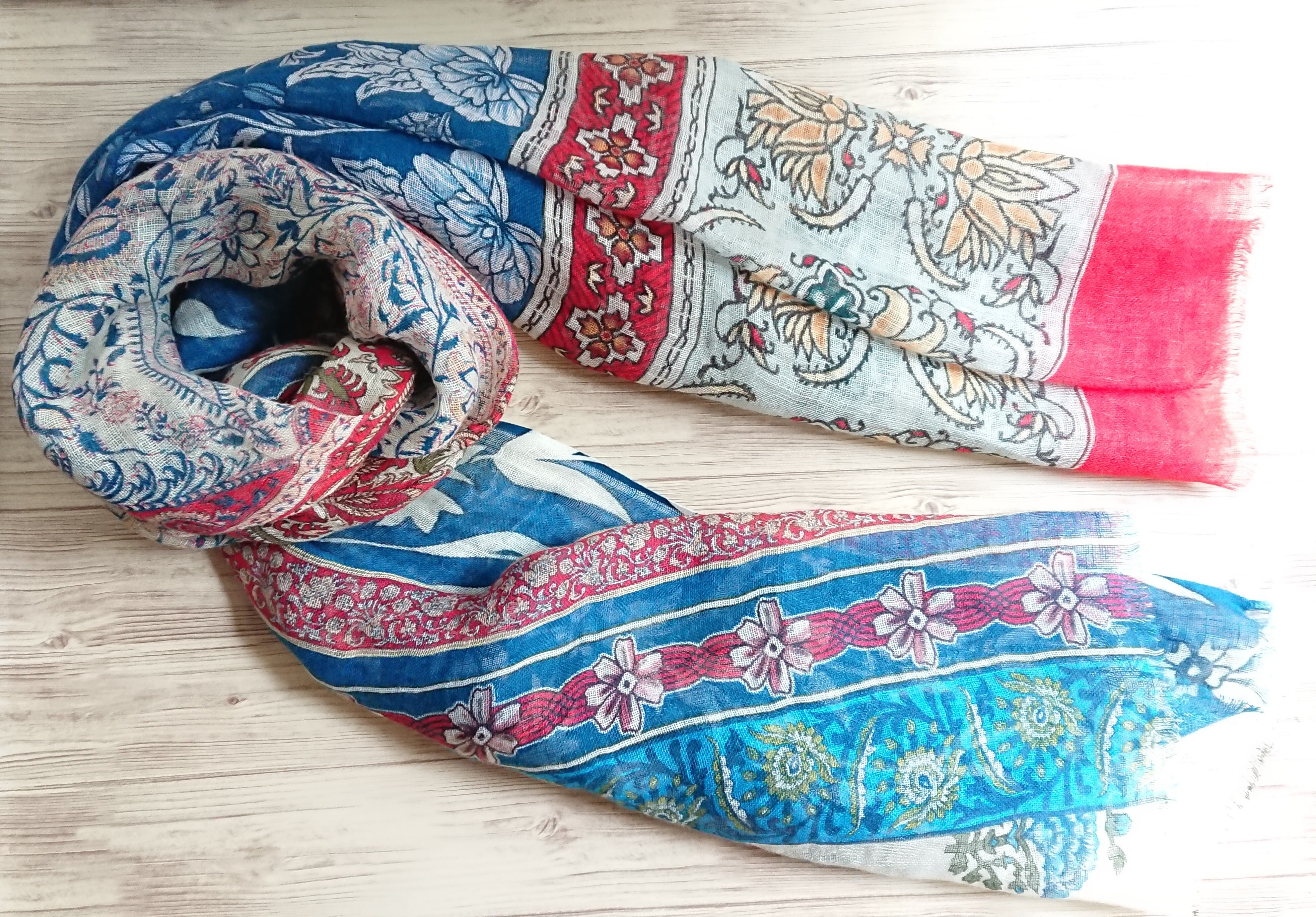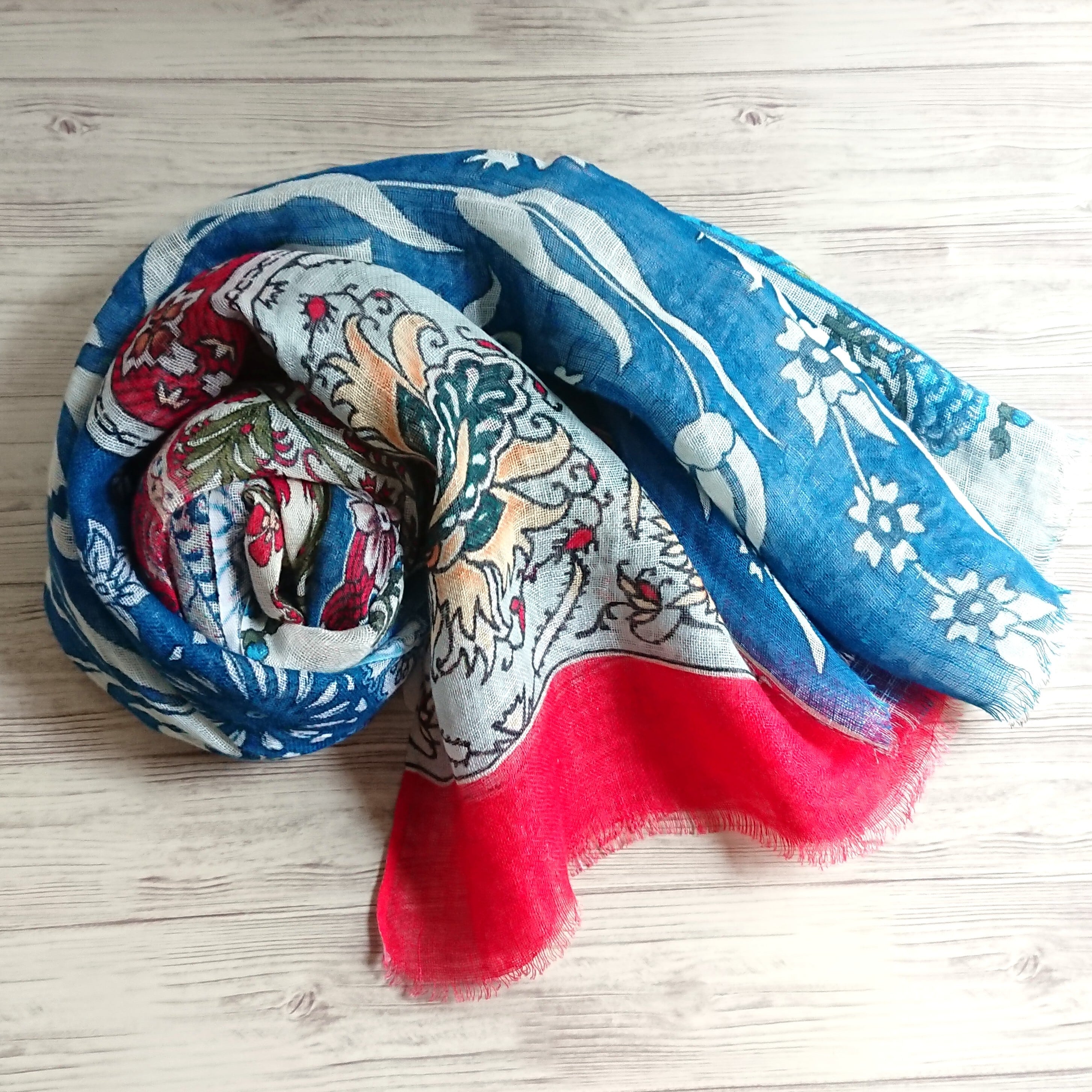 魅力的なブルーとレッドの色合いは、コーディネートに一瞬で華やかさをプラスしてくれることでしょう。この一枚をプラスするだけで、エスニック気分が楽しめます。