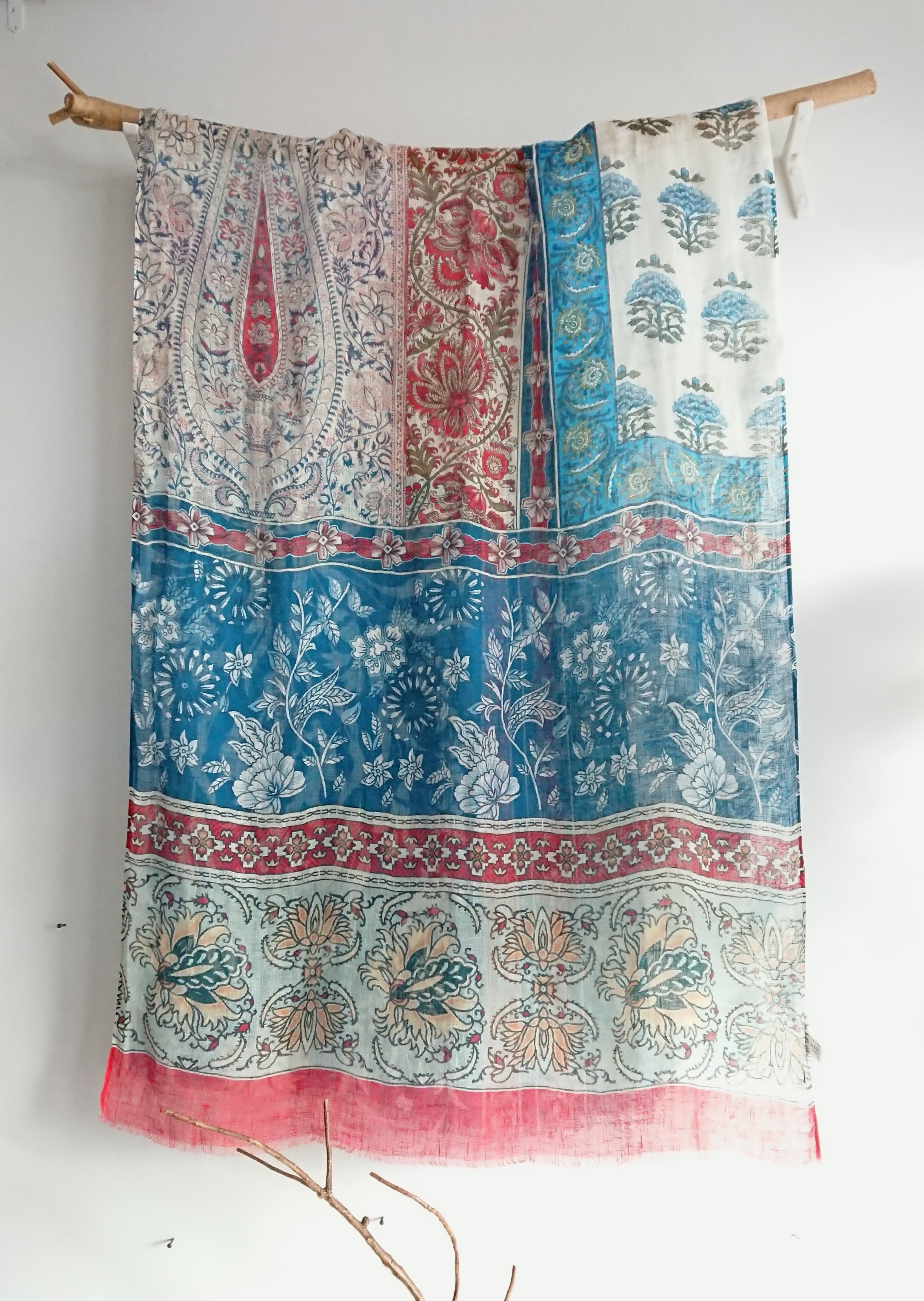 インドのブロックプリントで見るような絵柄が、いくつもパッチワークのように配置されて一枚のプリントになったリネンストールです。