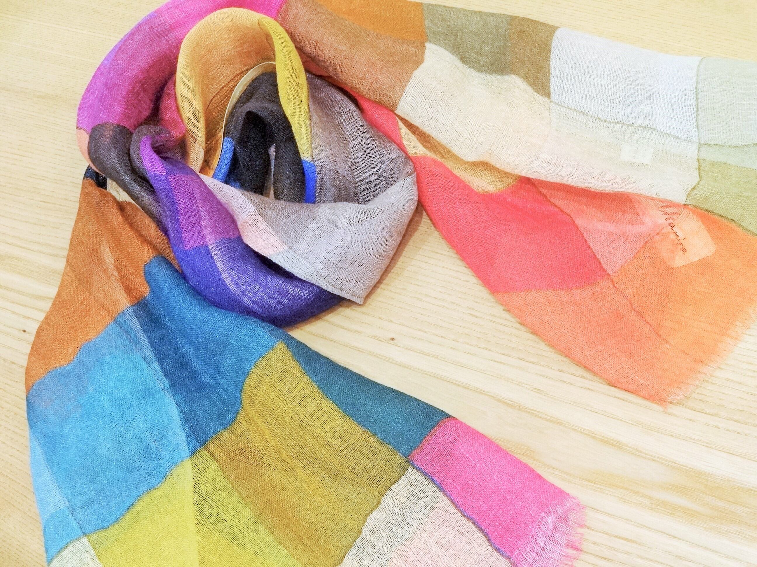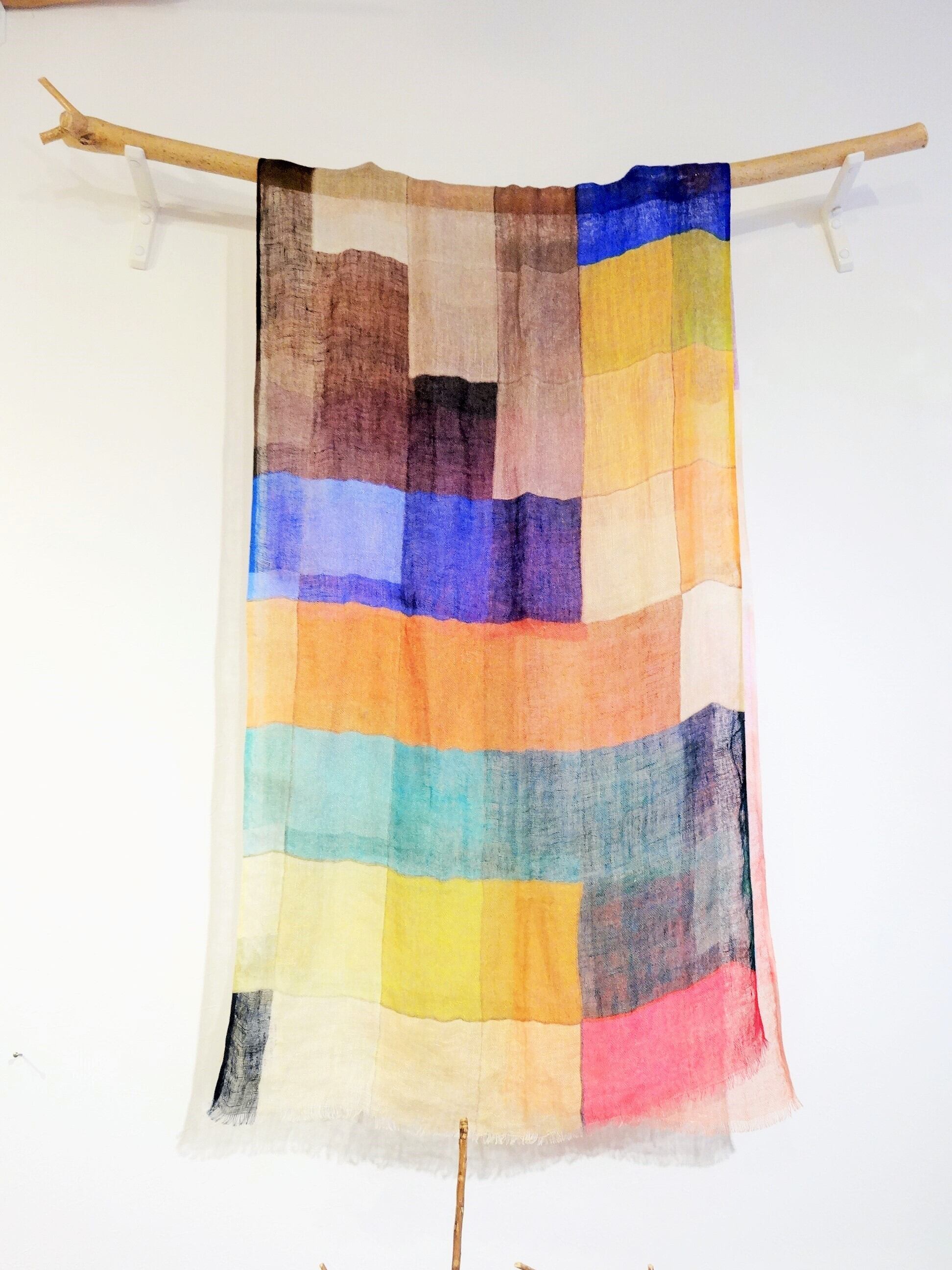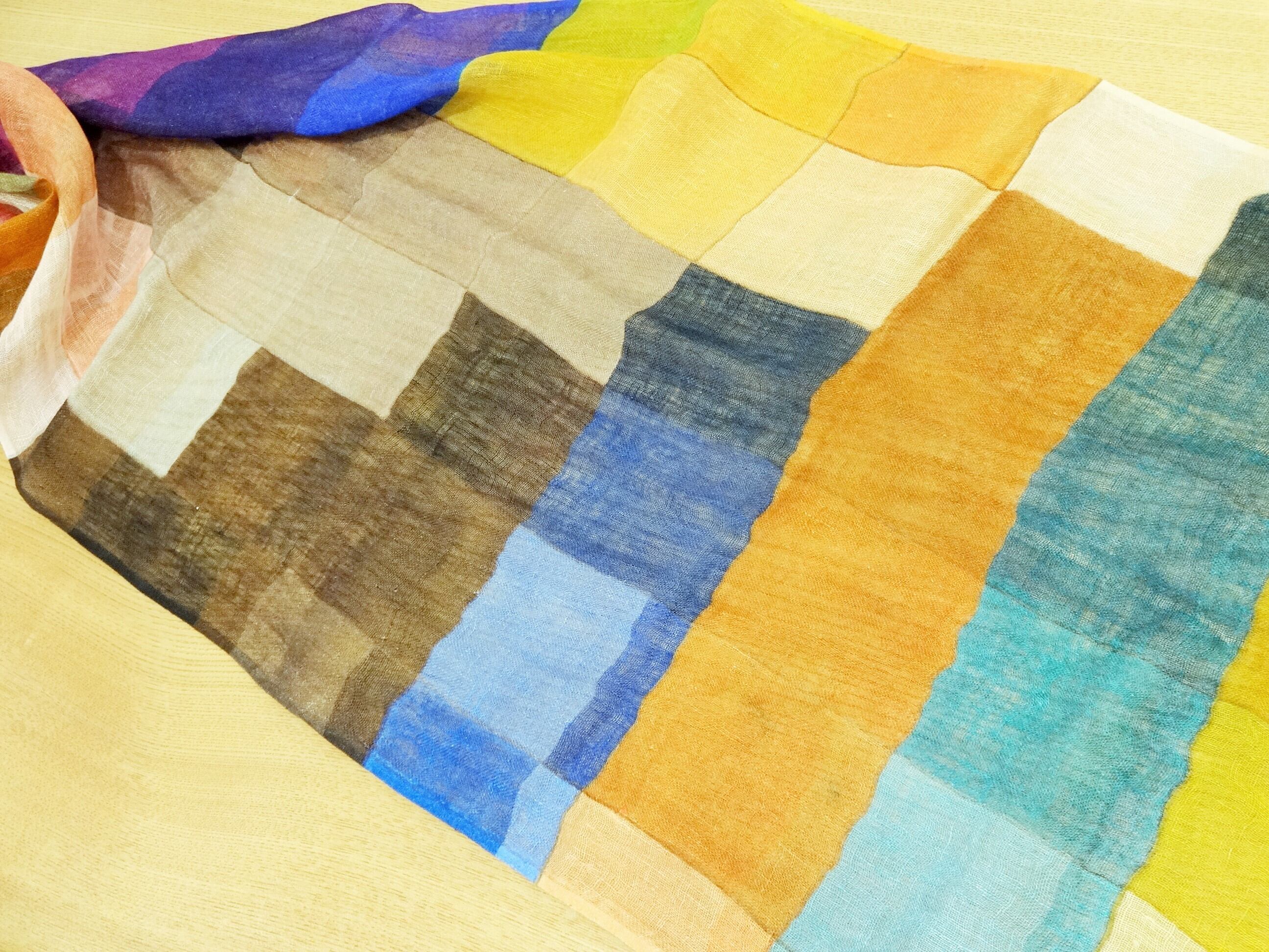 ディープカラーの色々を四角でならべたデザインのリネンストールです。