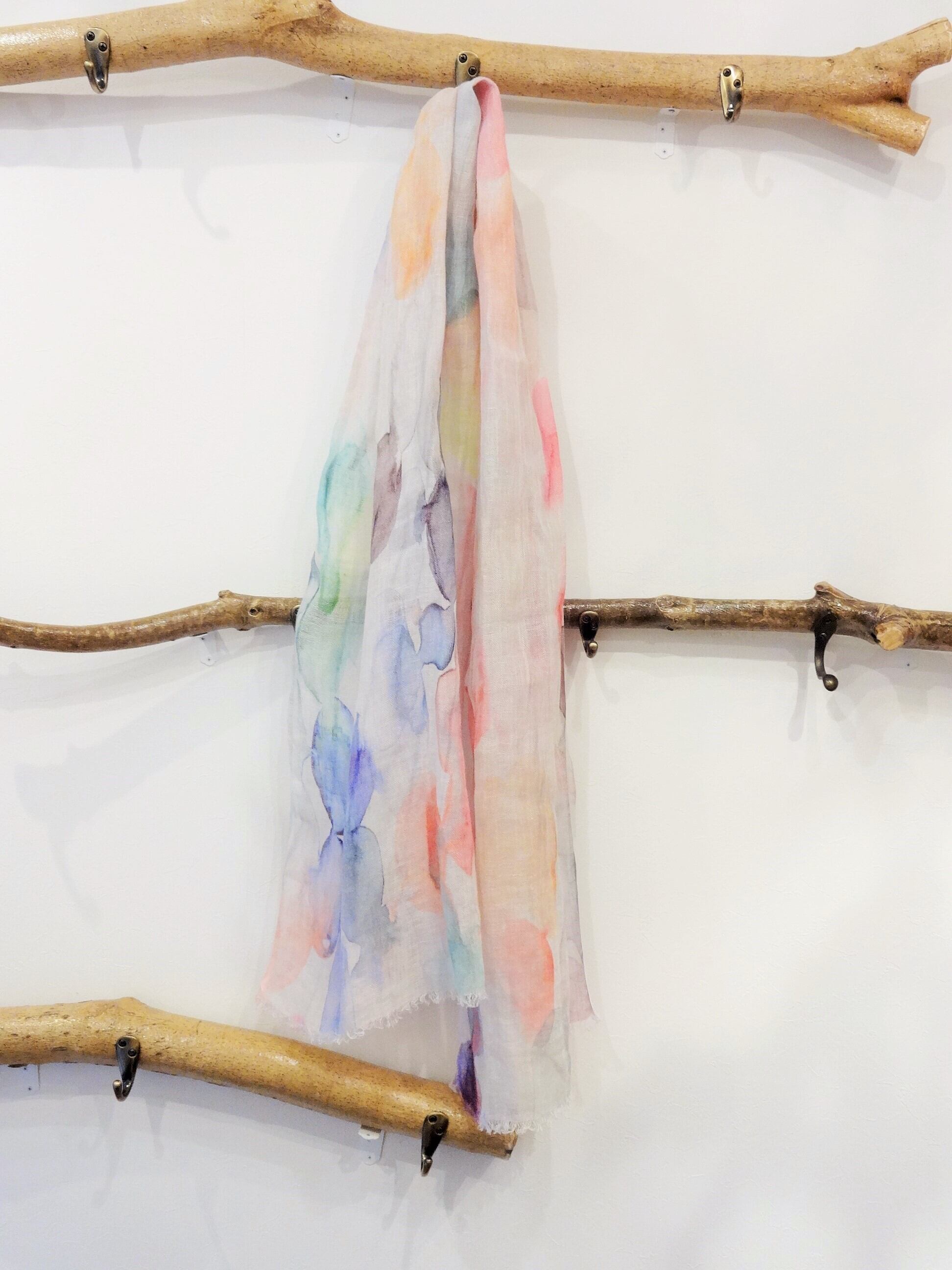 やさしいパステルカラーを水彩画のようなタッチでぼかしたデザインのリネンストール。