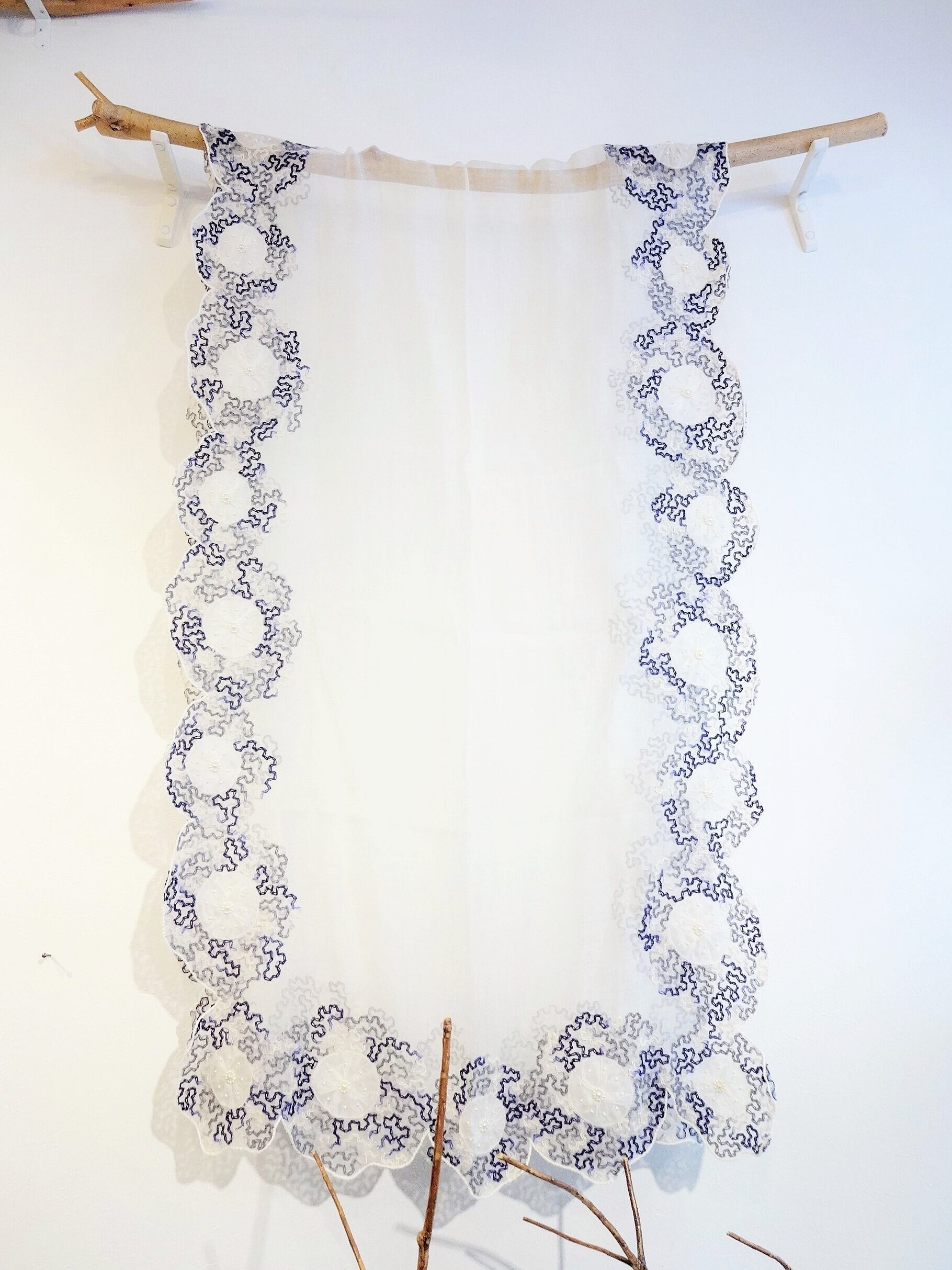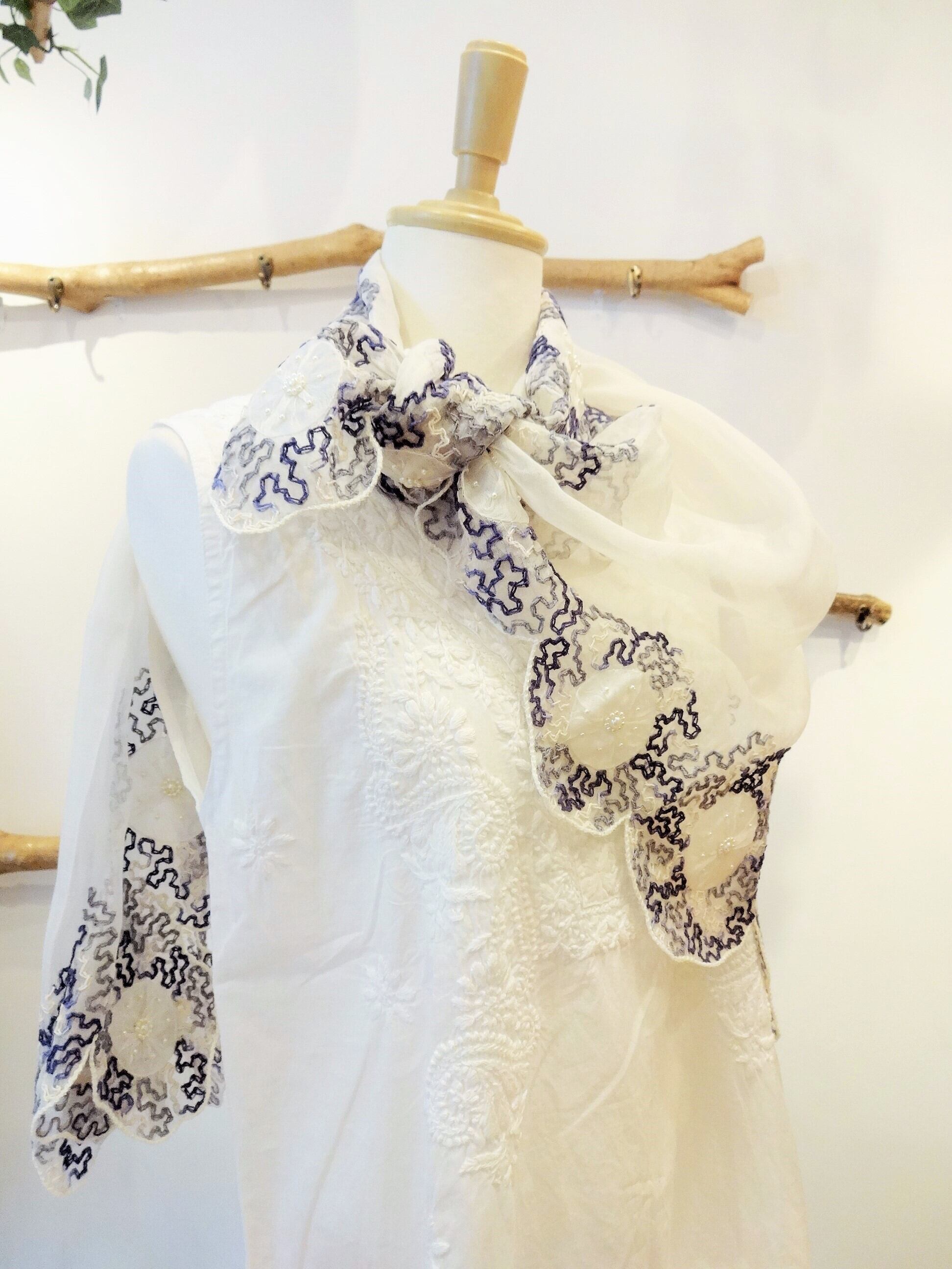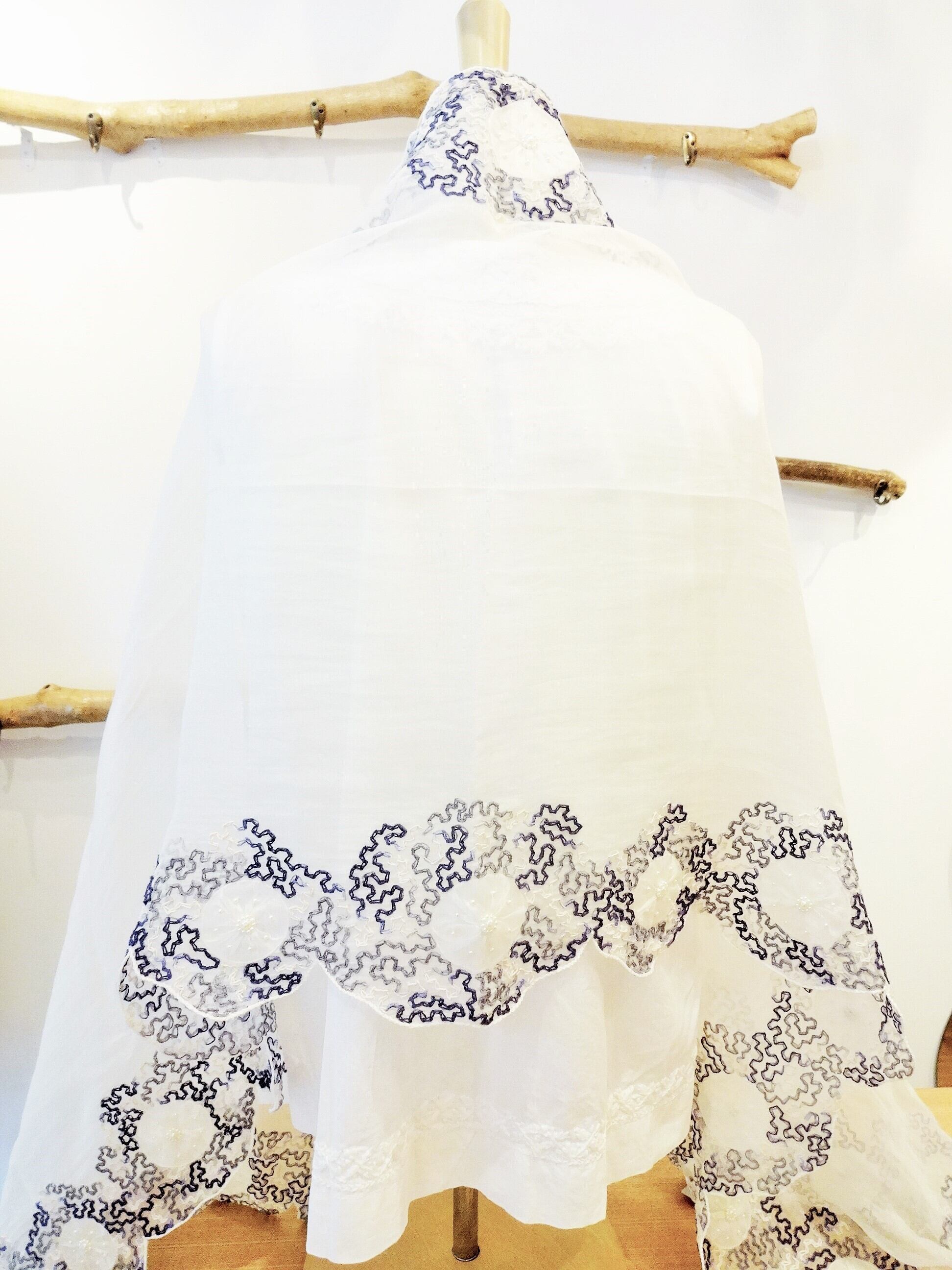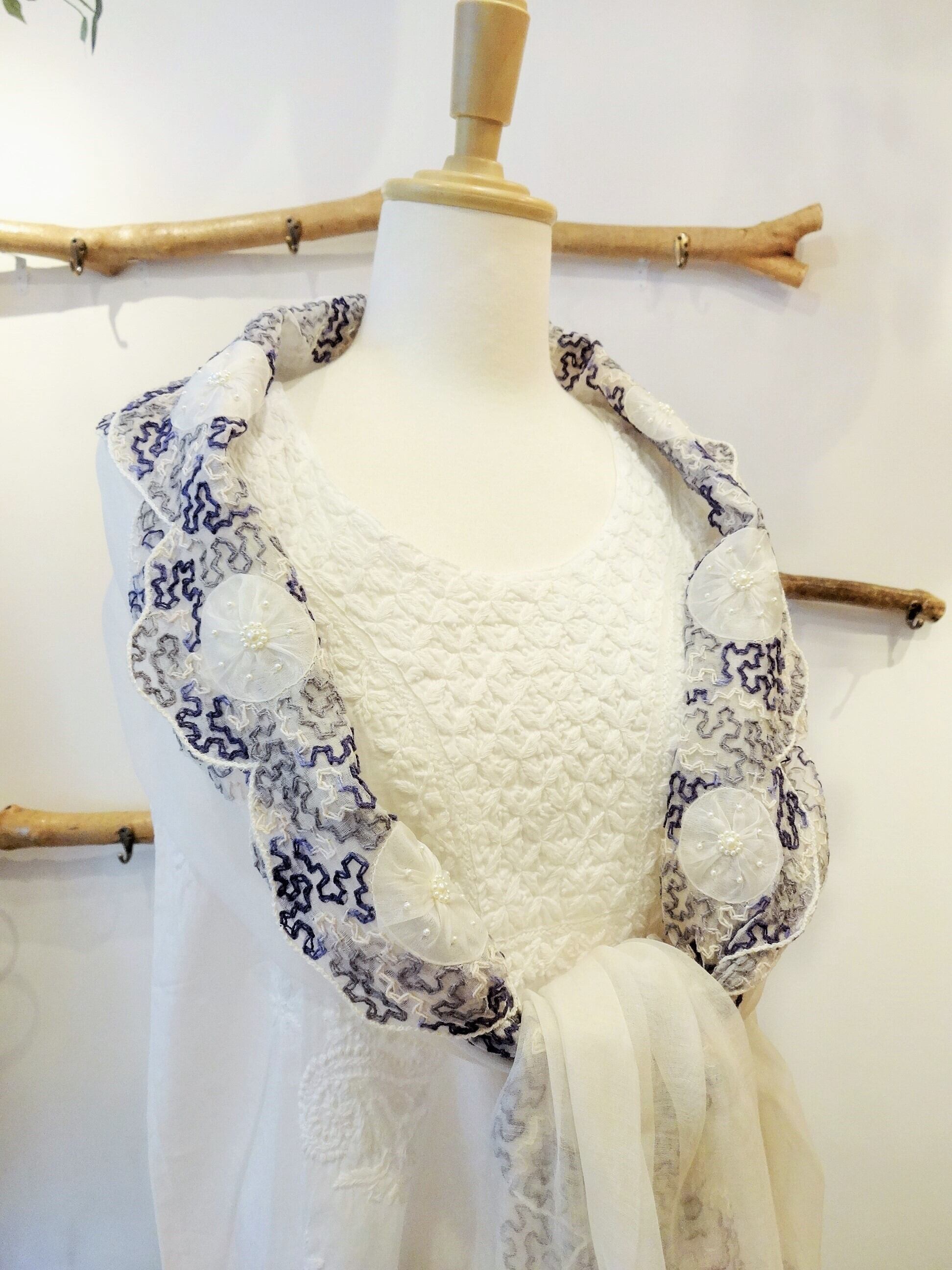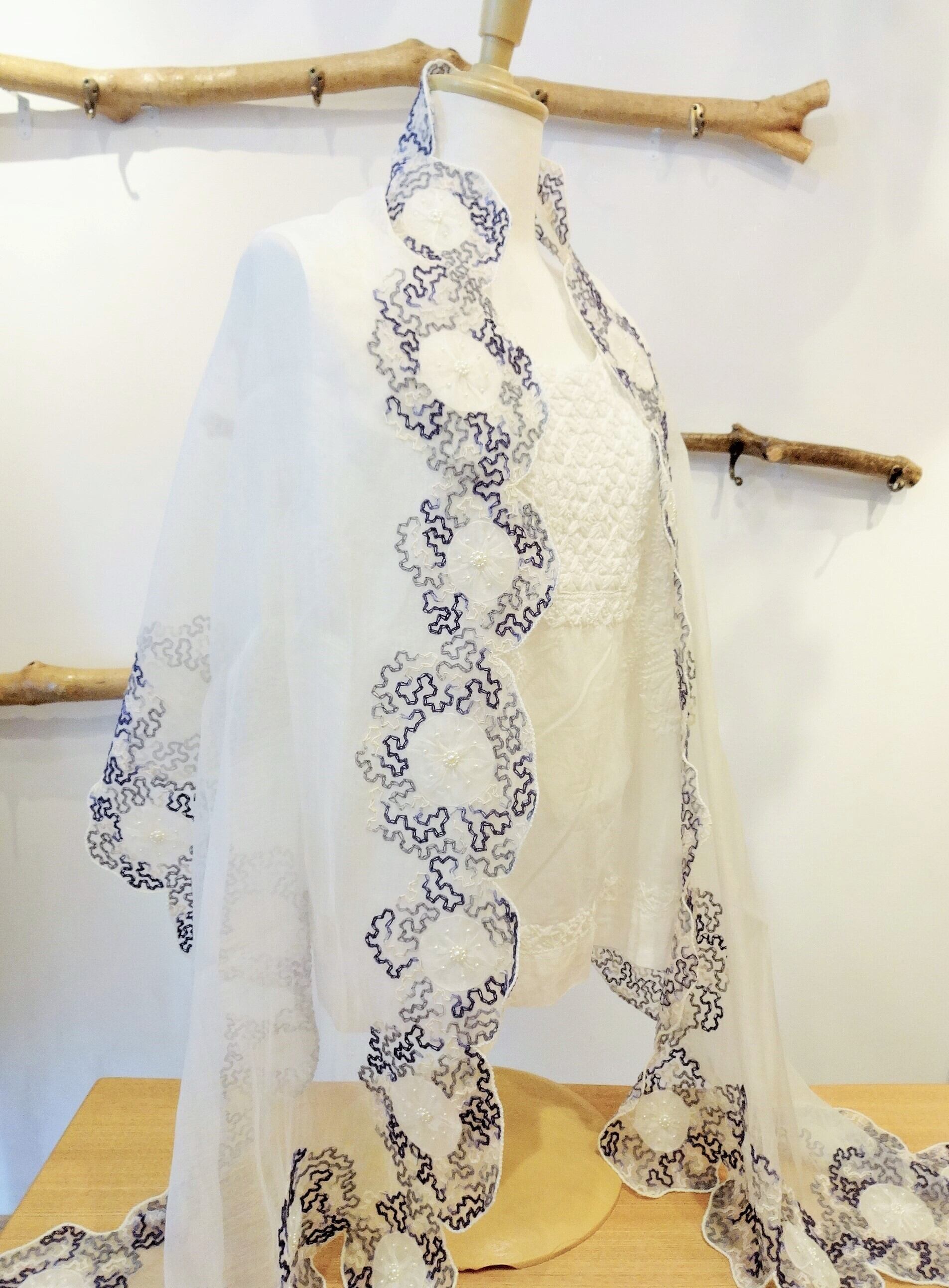 オフホワイトのベースカラーで、周囲にネイビー・グレー・生成の糸の手刺繍が施されたパーティーショールです。