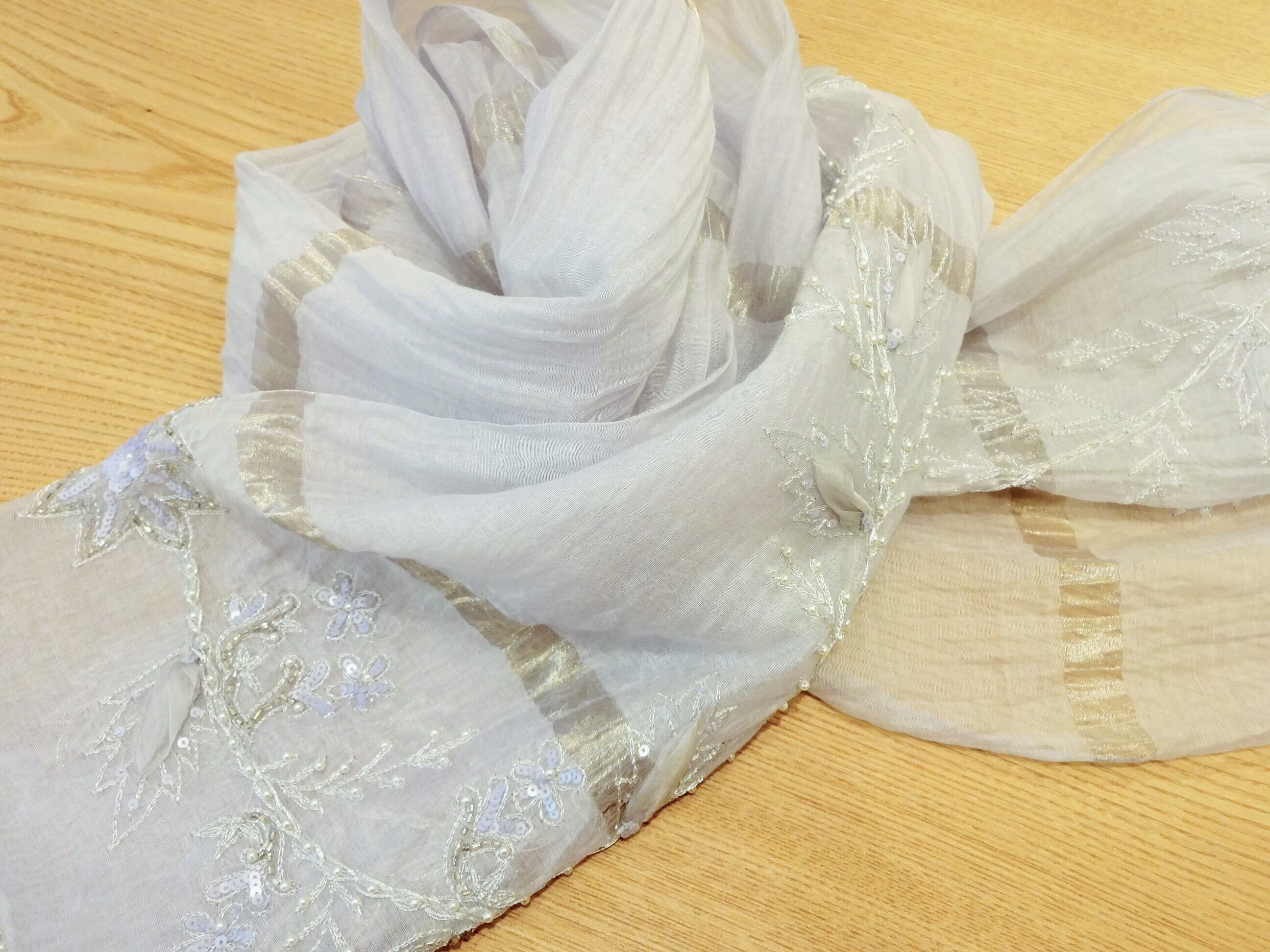 神秘的な美しさ シルバーグレーの刺繍ストール シルクコットン