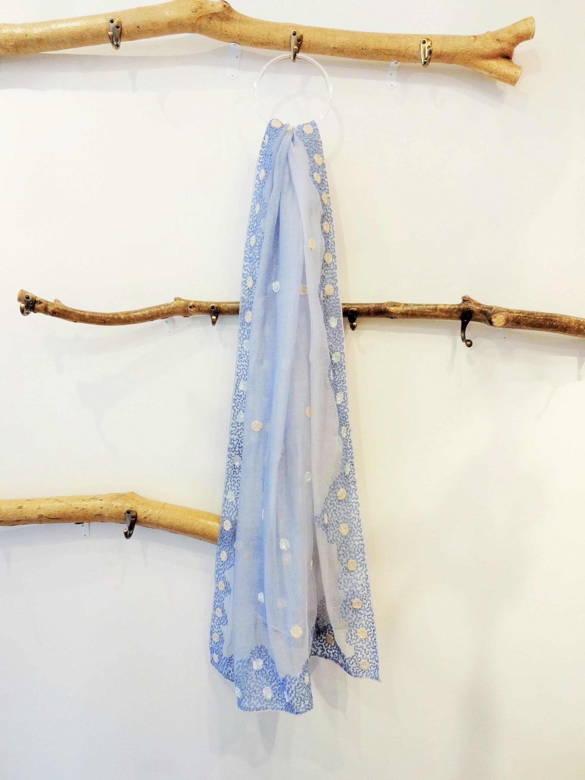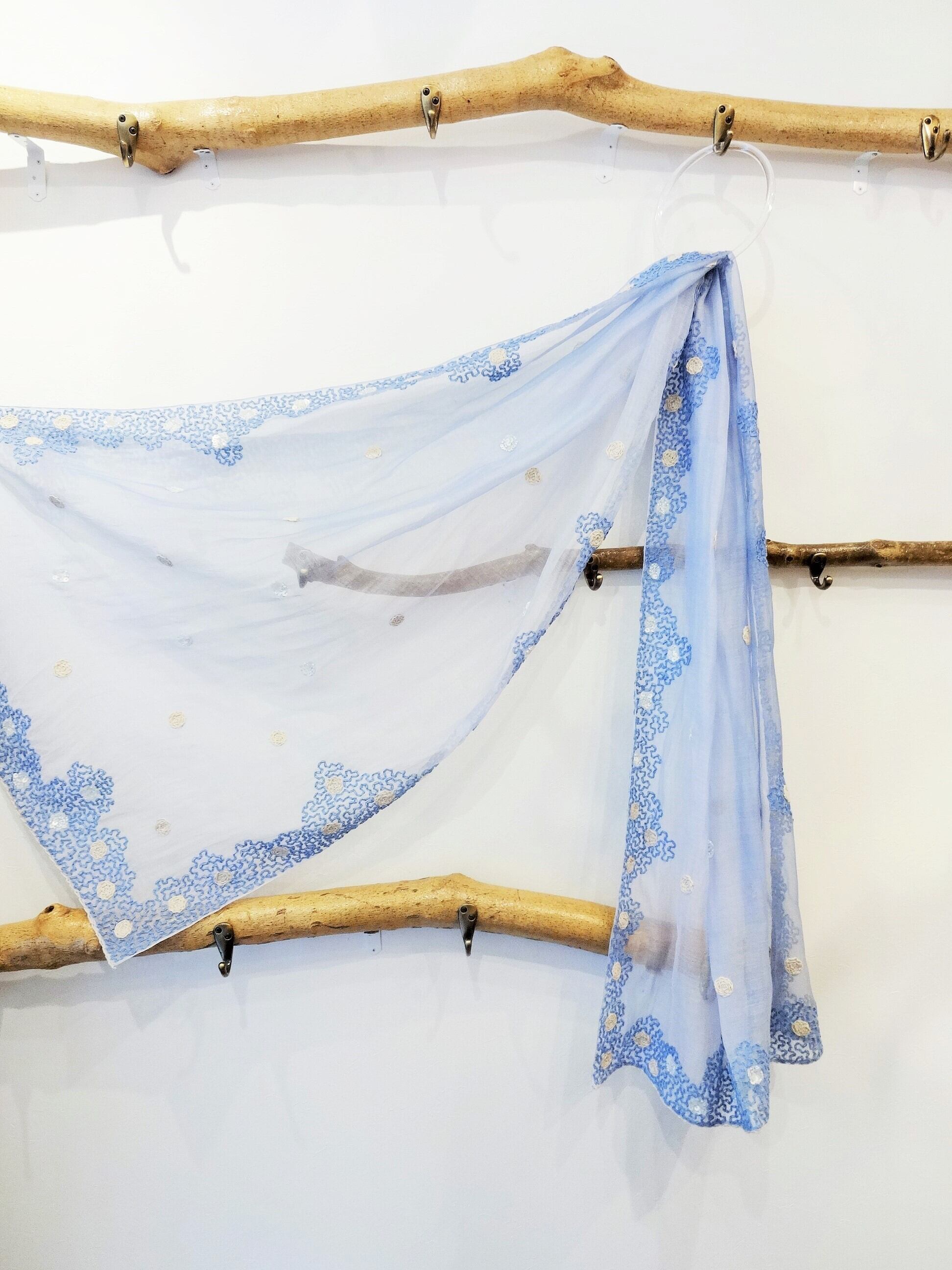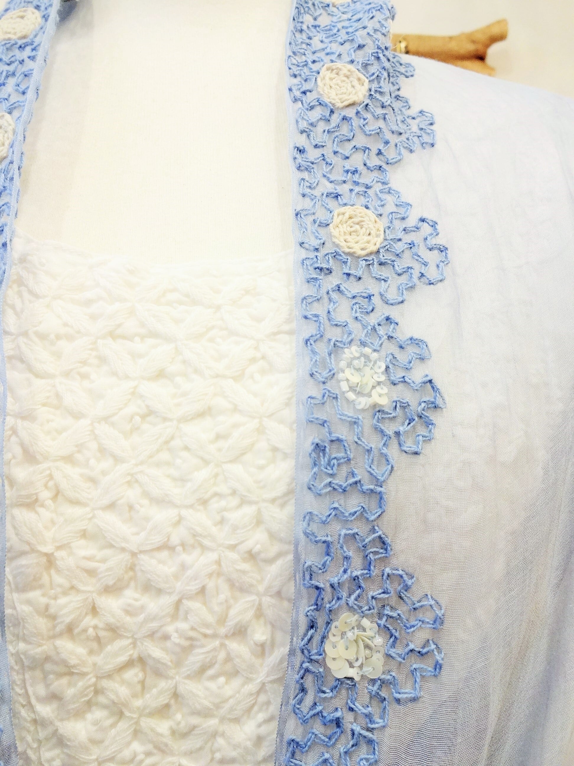 涼し気な透け感のブルーと手刺繍のドットが特徴のパーティーショールです。