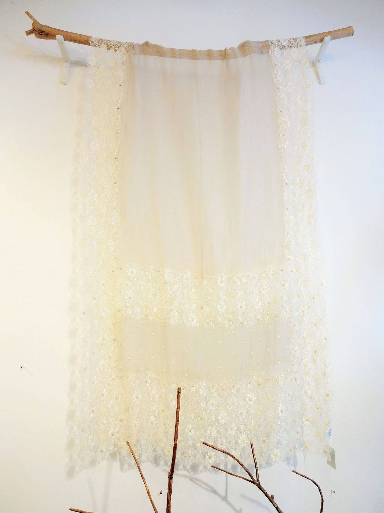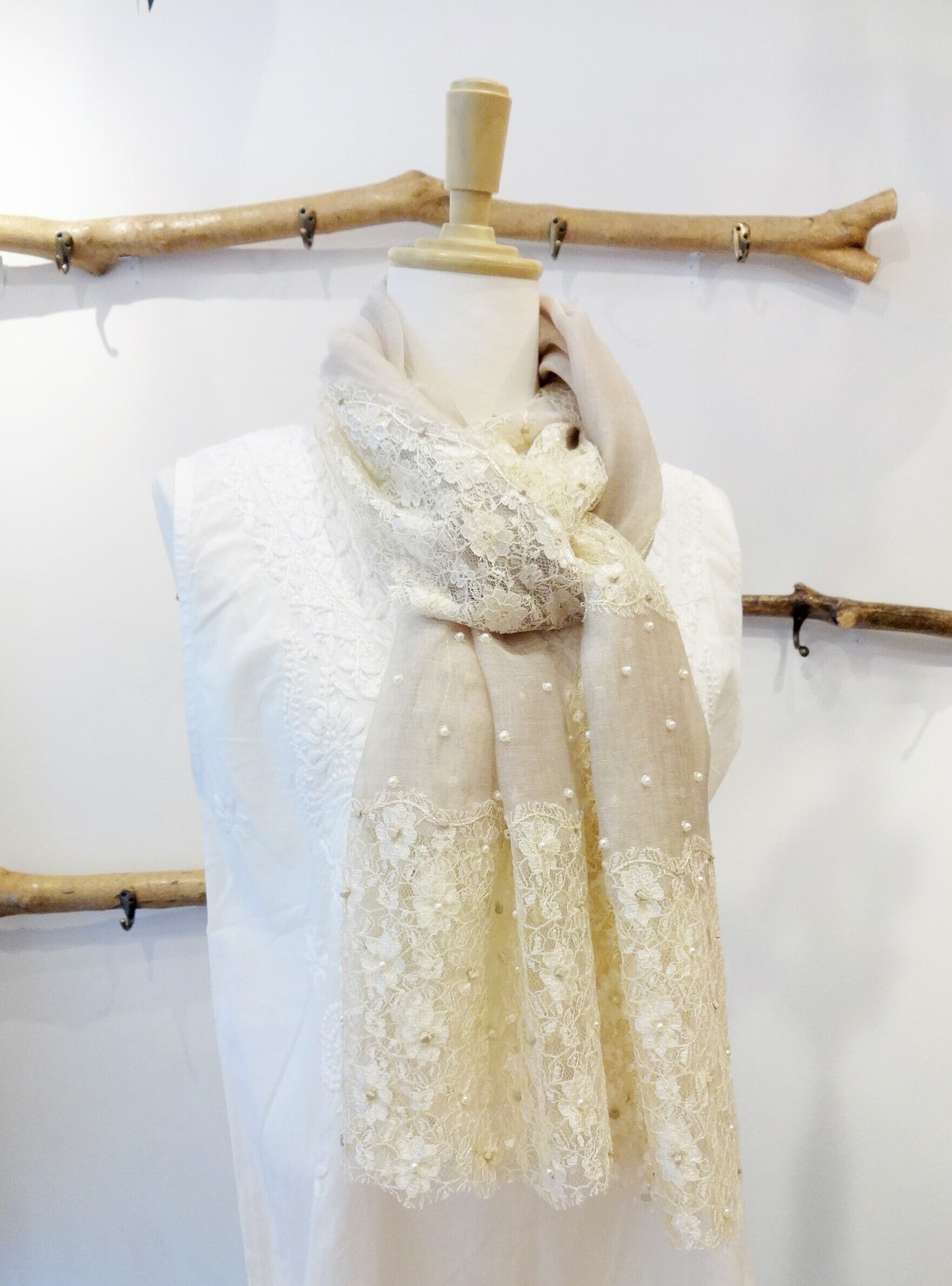 ベージュのレースストール(ビーズ付き) シルクコットン