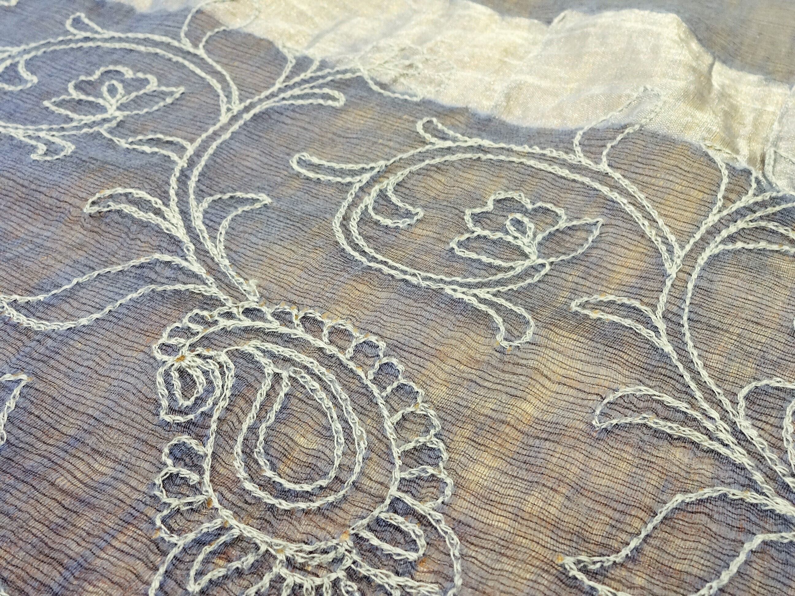 ネイビーのベースにグレーの糸でペーズリーフラワーが全面に刺繍されている、シルクウールのショールです。