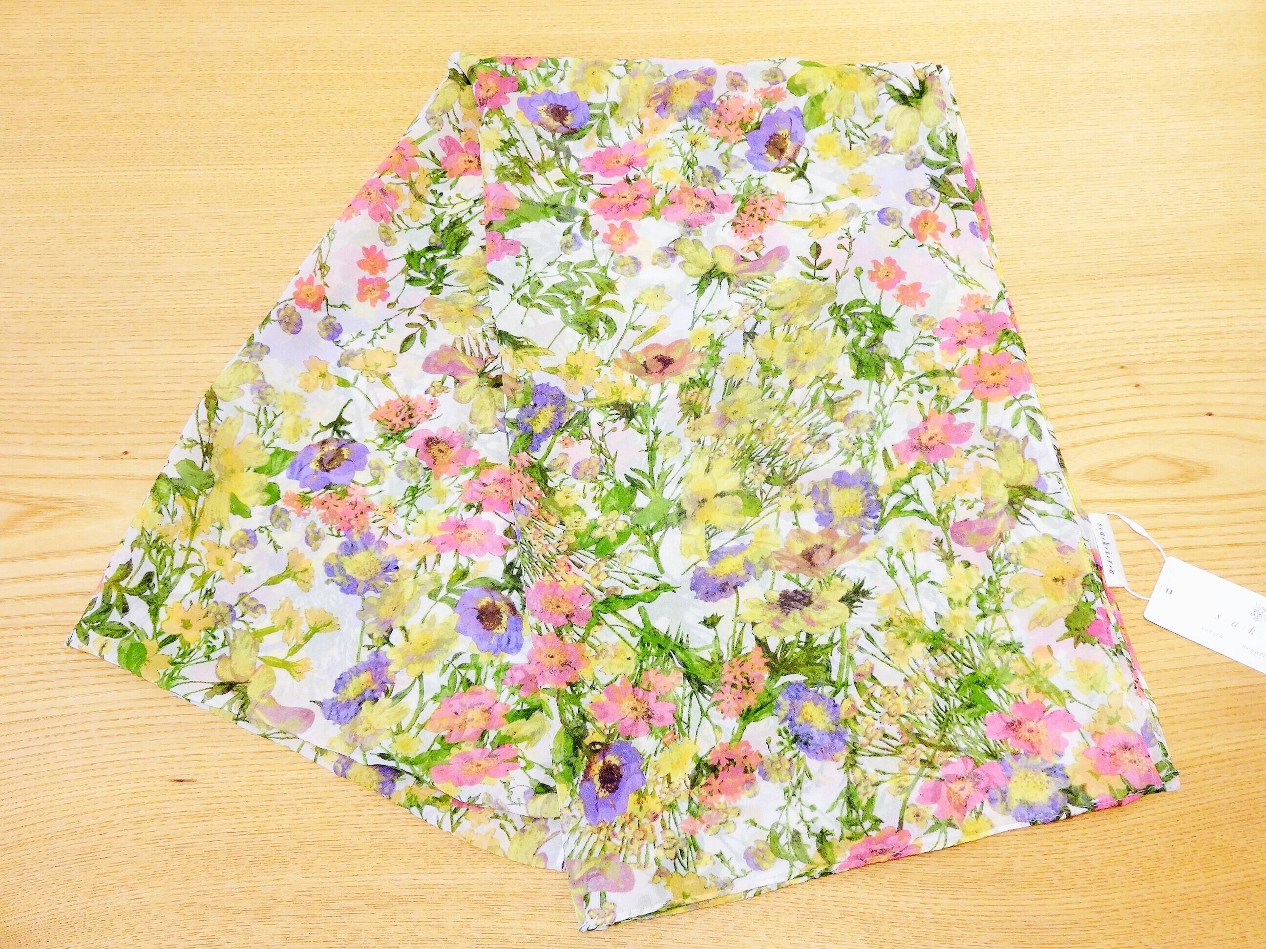白地にピンクやイエロー、オレンジ、パープルなど色とりどりの草花が描かれた、お花畑のような多色使いのデザインです。明るく優しい雰囲気のストールです。