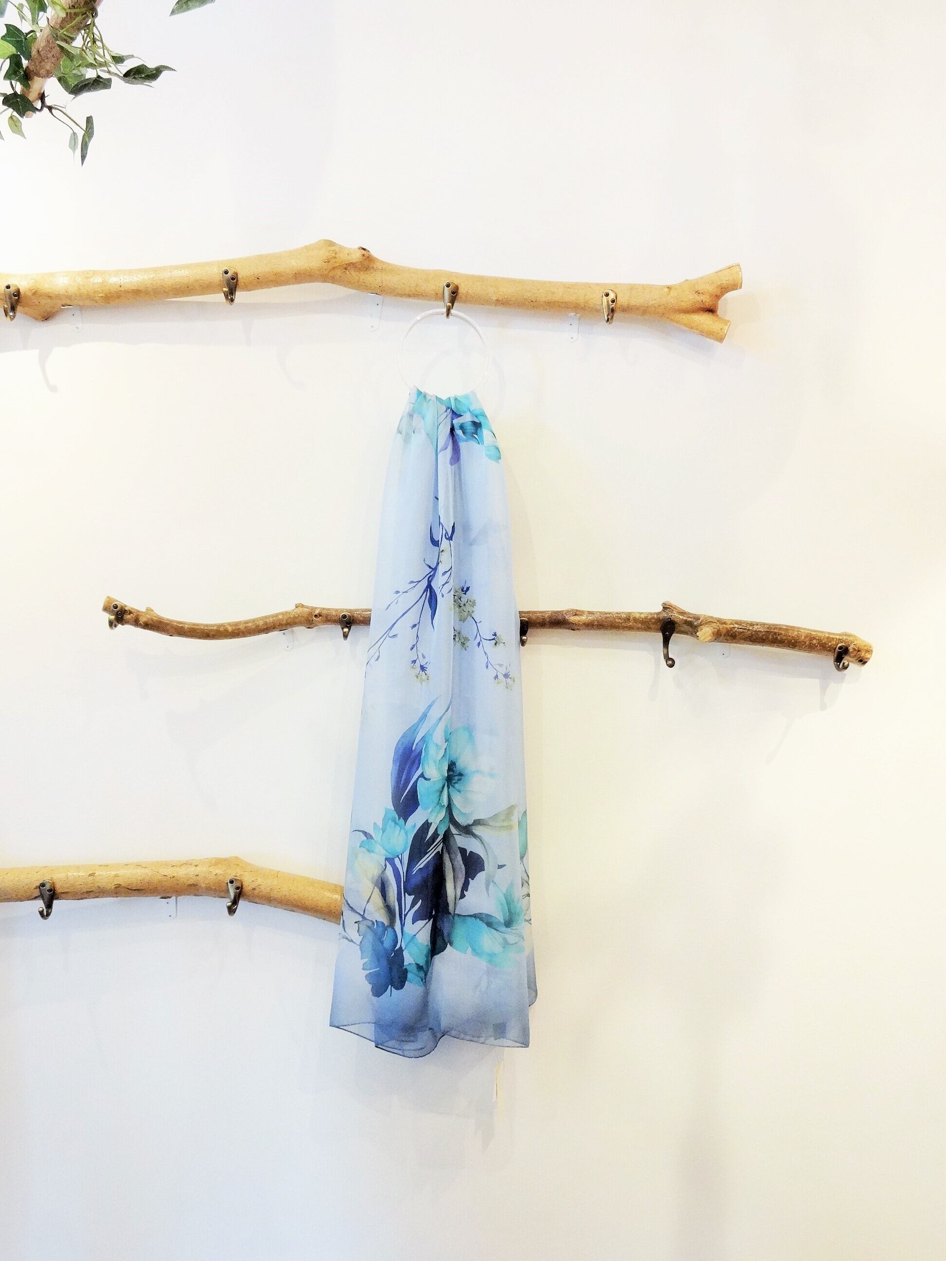 落ち着いたブルーのグラデーションをベースにした、上品なフラワープリントのシルクストールです。