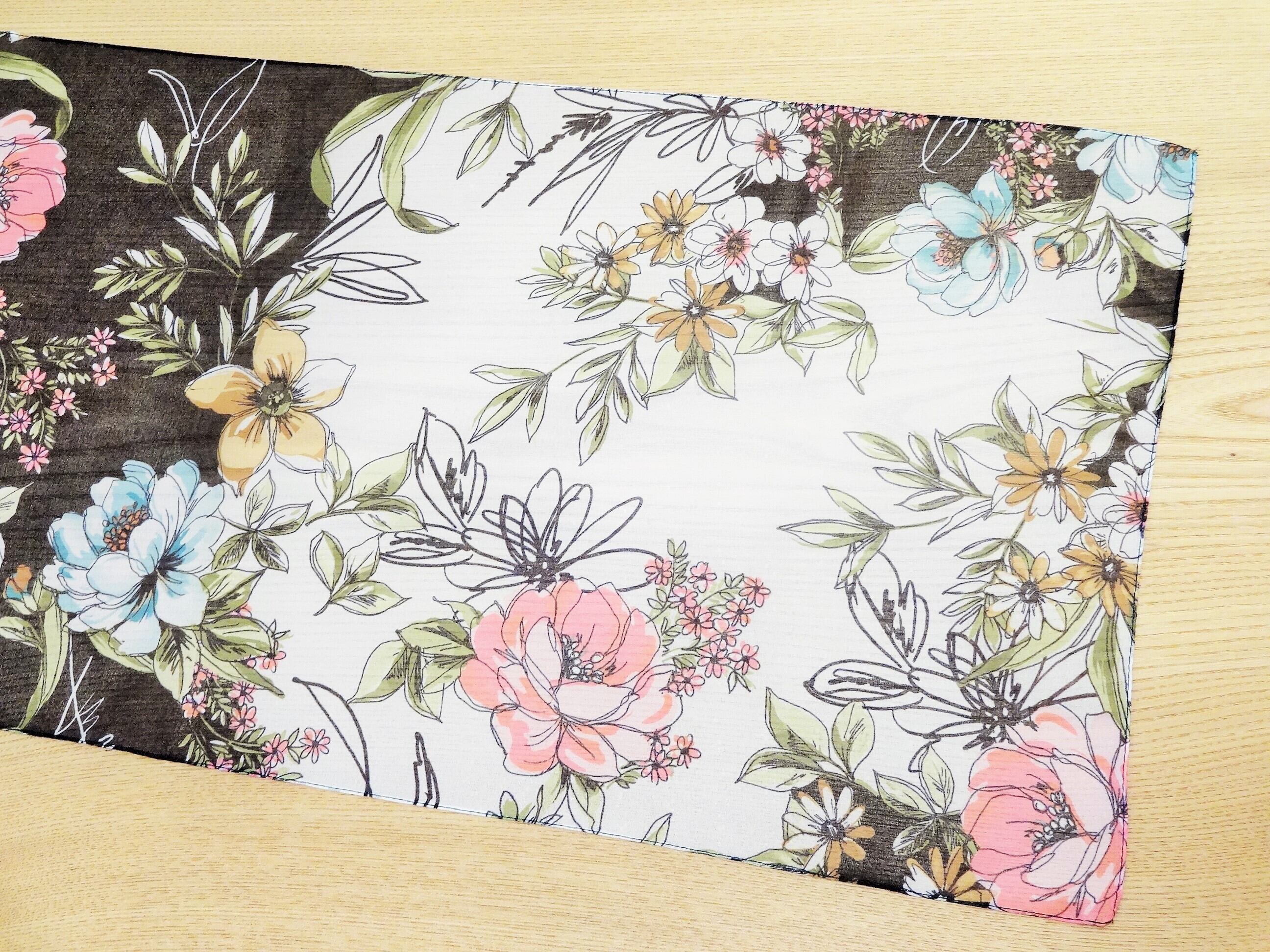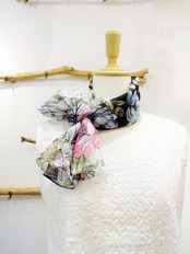 モノトーンにピンクの花が印象的な長方形スカーフです。