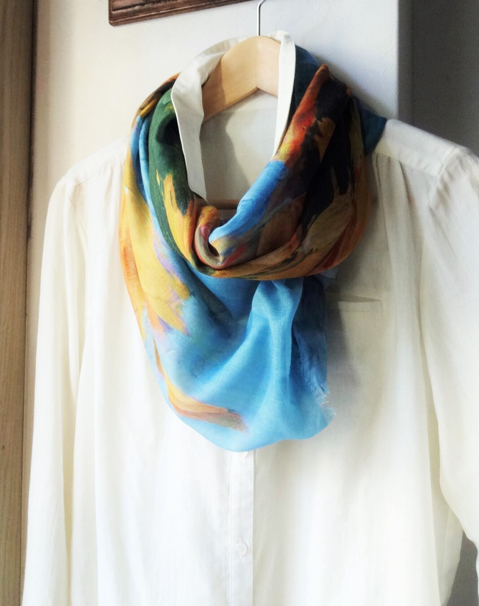 大きなひまわりが描かれた、絵画をプリントしたデザインのストールです。