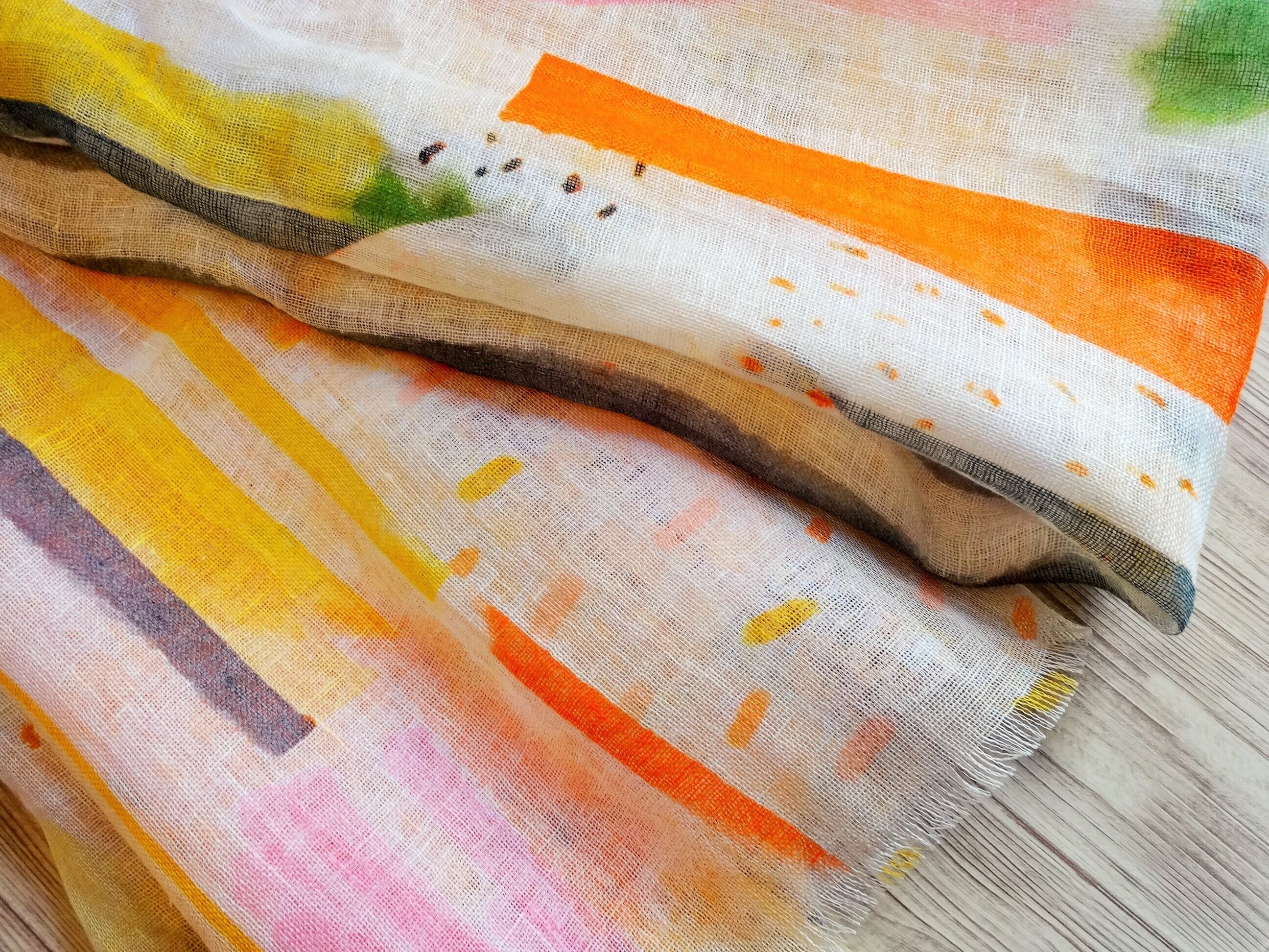 春の公園で気の向くままにペイントしたような、カラフルなデザインのリネンストールです。