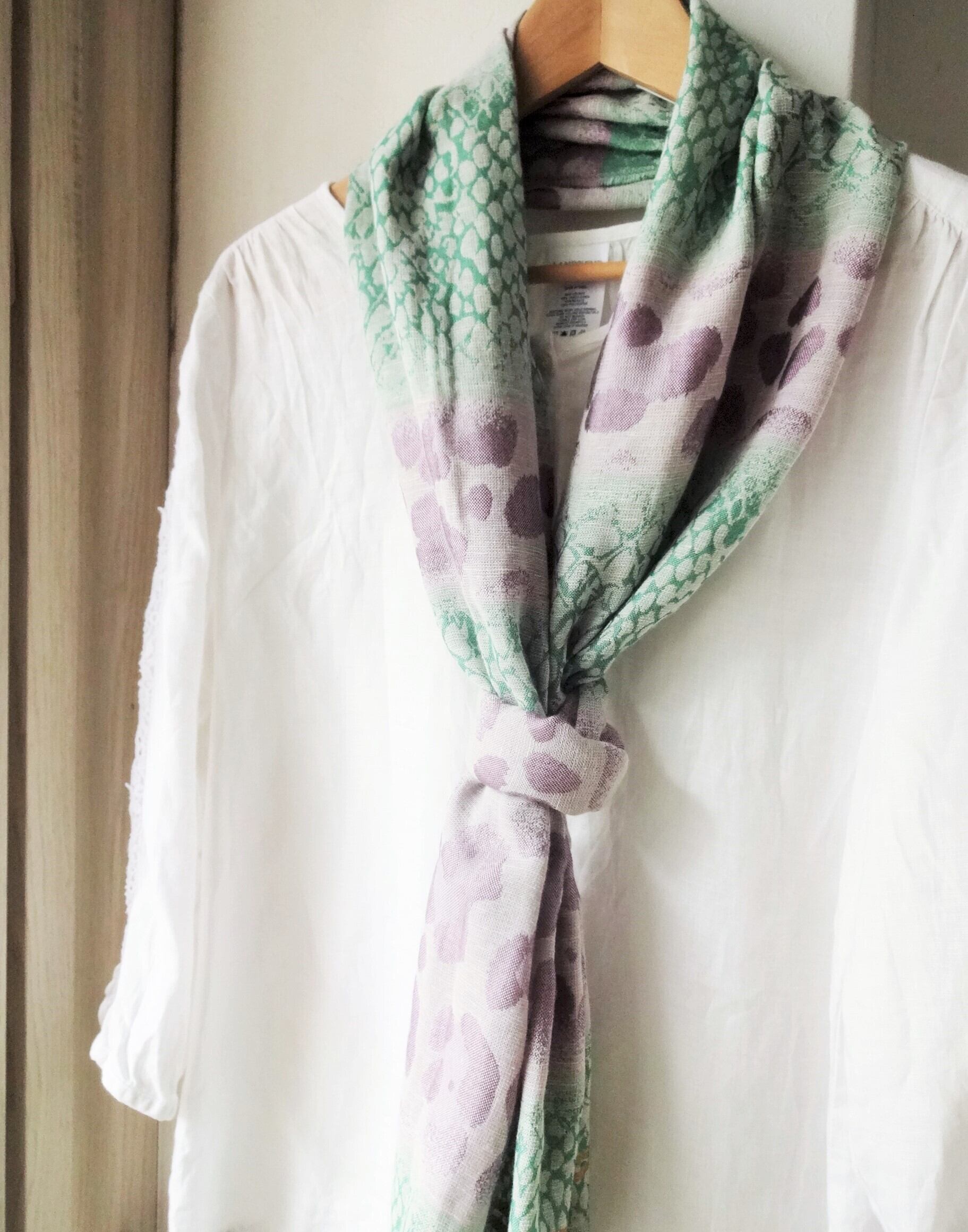 ラベンダーとグリーンの配色が印象的なレオパード柄の織ストールです。