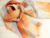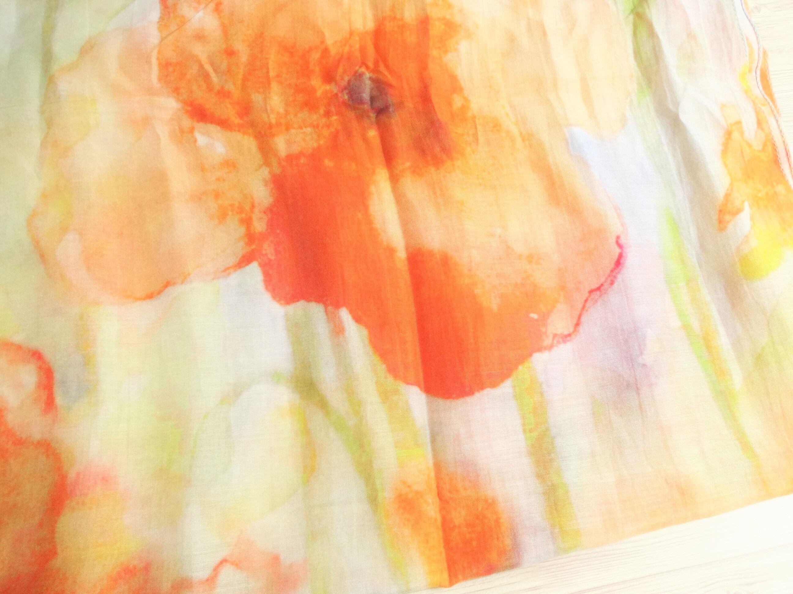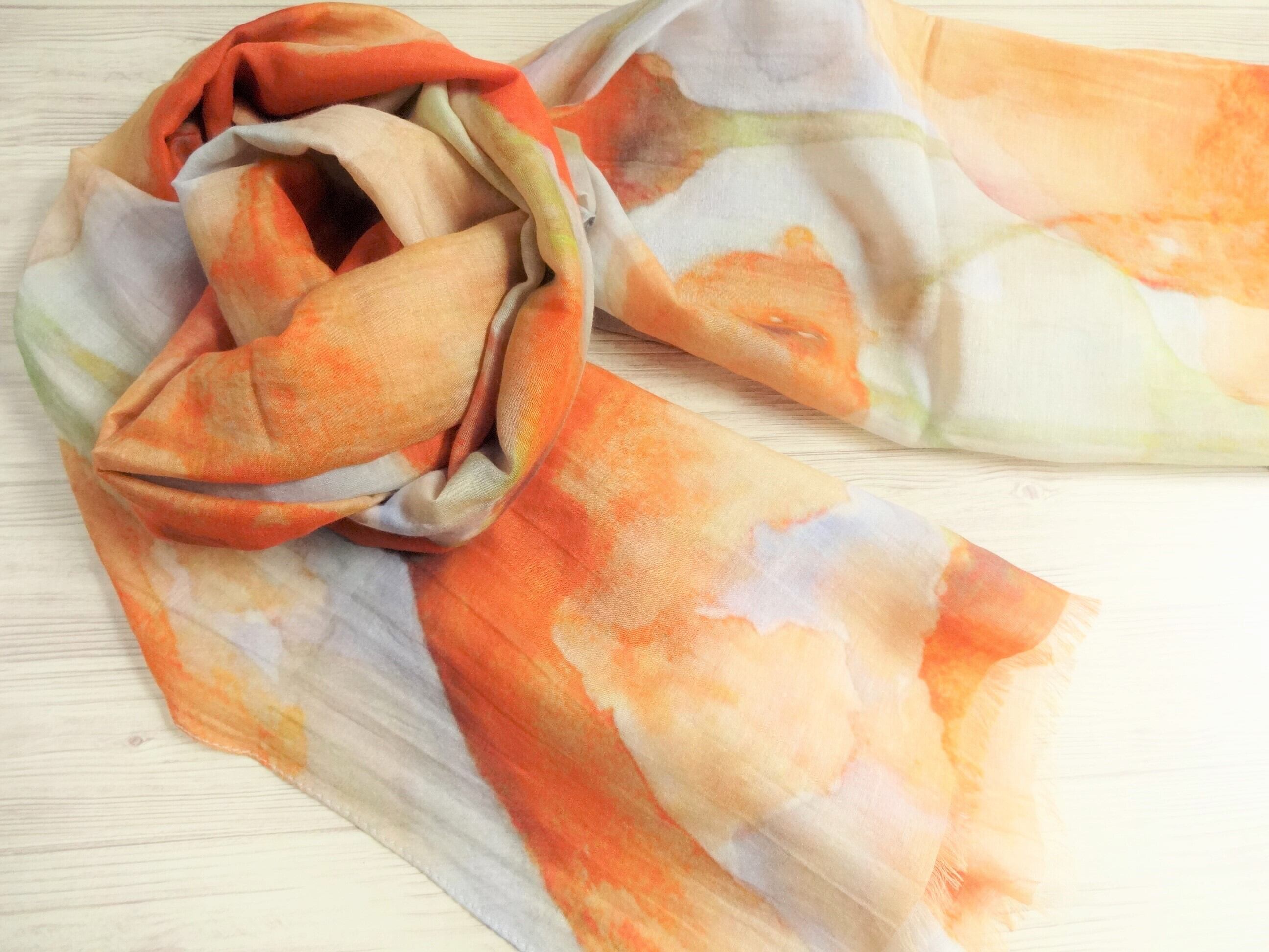オレンジ色の大きなお花がたくさん描かれたストールですが、巻いてしまうと花とはわからず、オレンジ、キミドリ、ベージュのぼかしグラデーションのような感じに見えます。