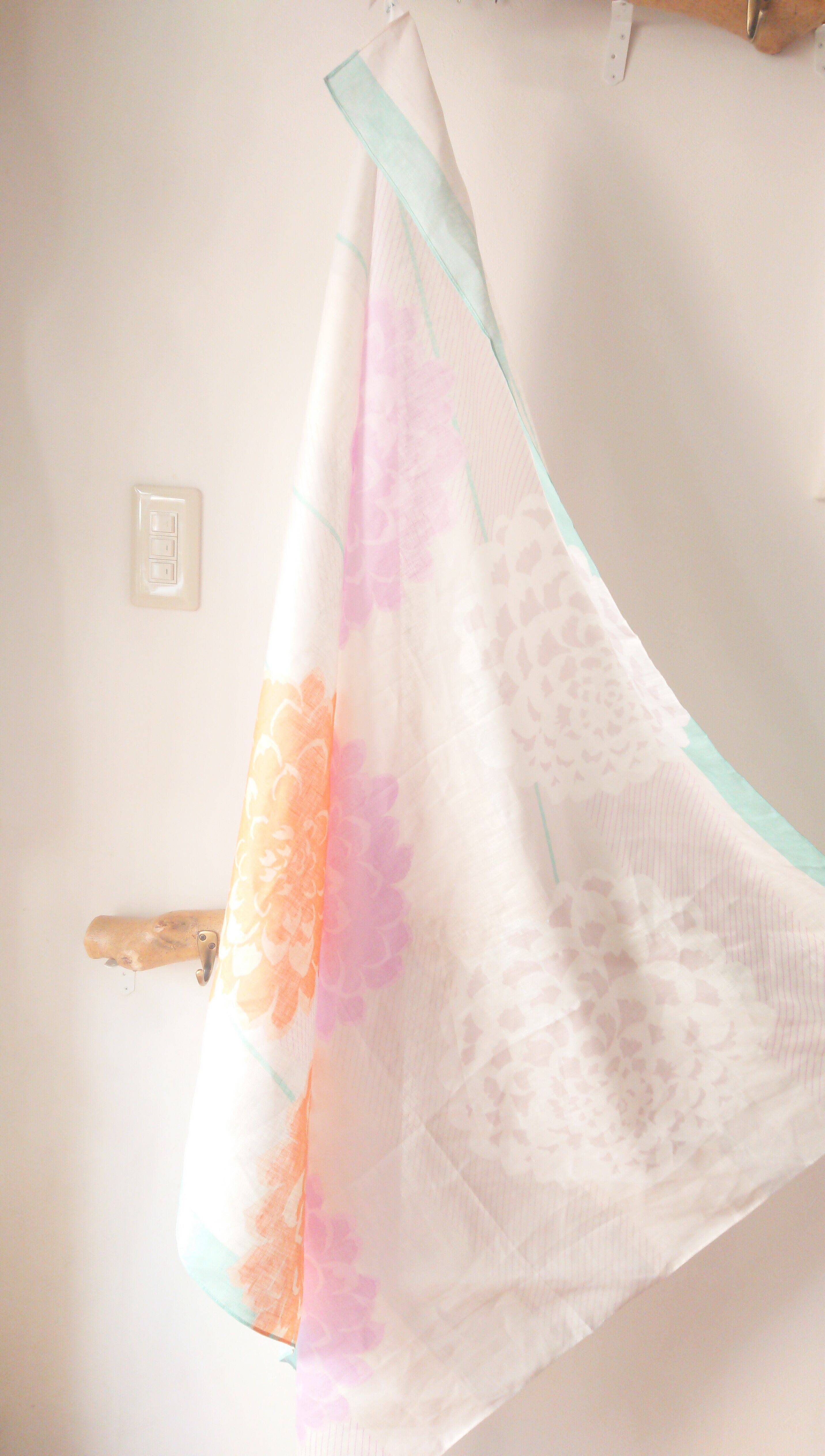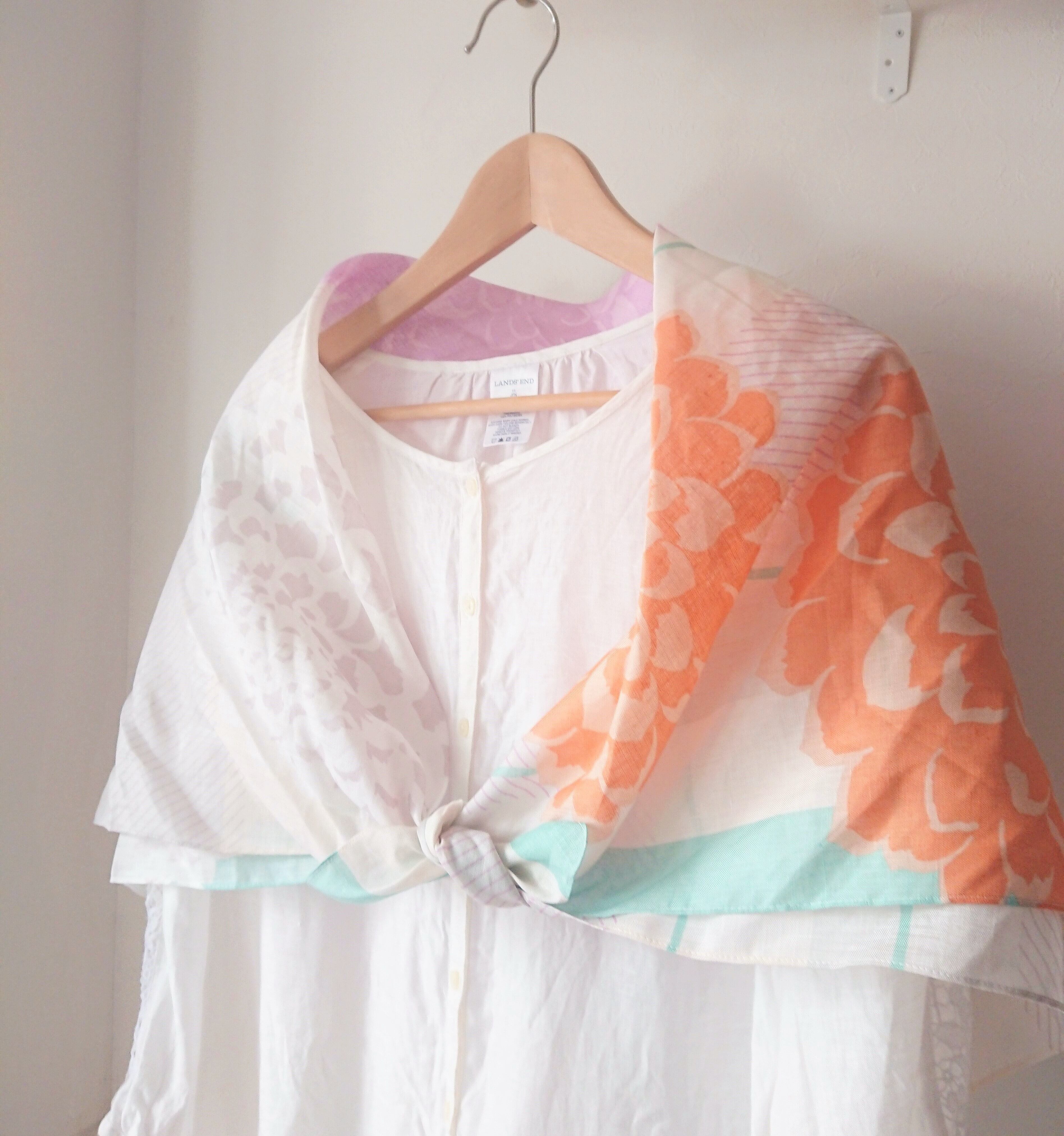 こちらは〈ふろしき〉として発売されているものですが、華やかなデザインと心地好い風合いのため、大判スカーフとしての利用を提案させていただきます。