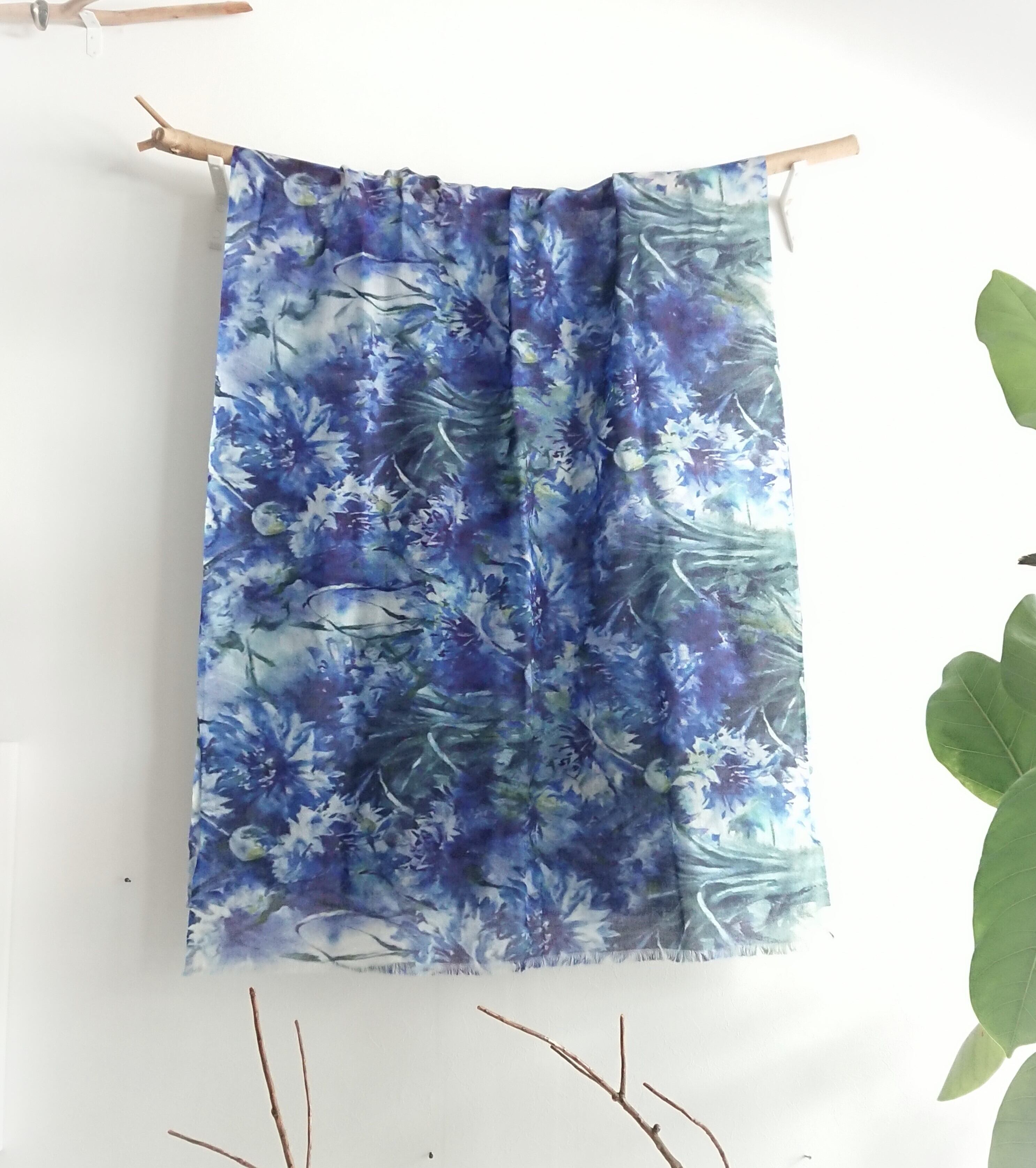 深いネイビーブルーの花描かれたデジタルプリントのシルクウールストールです。