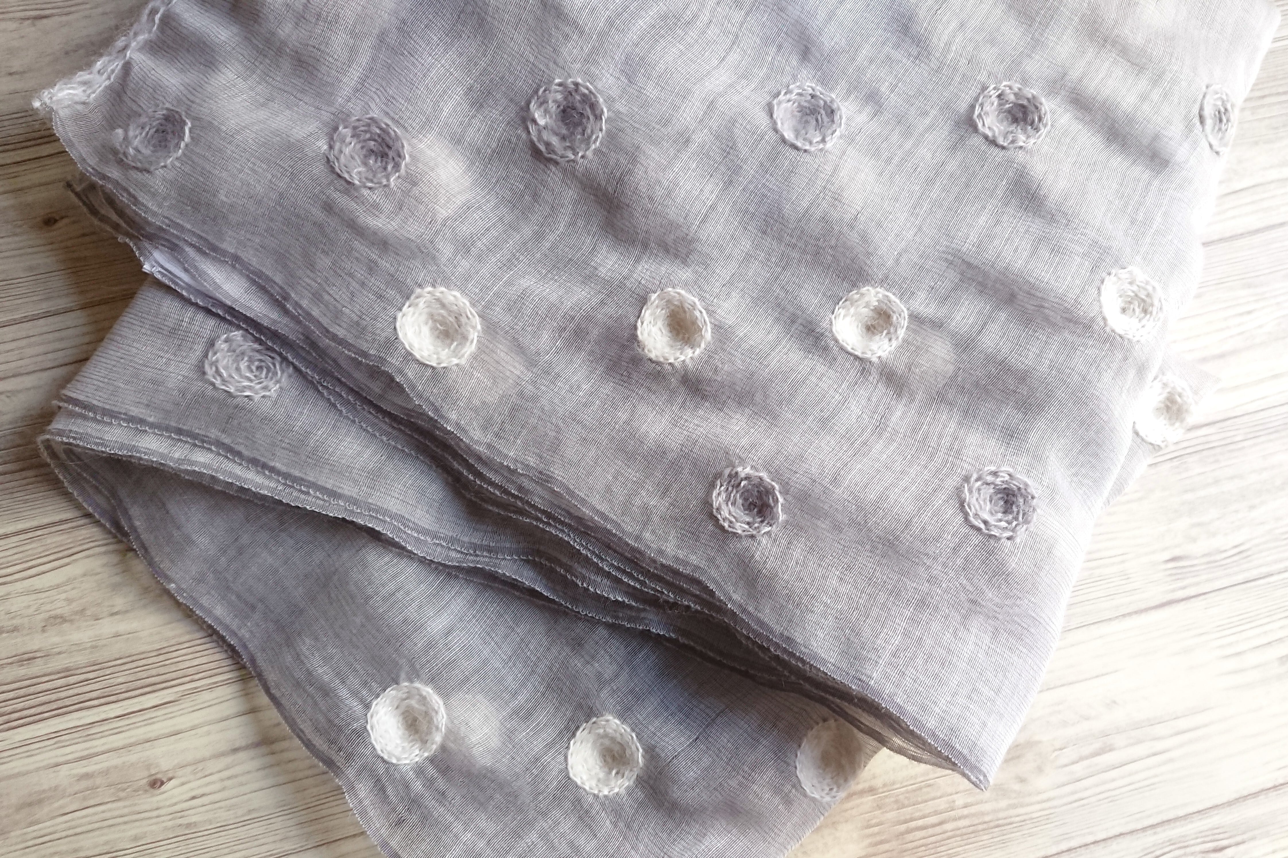 白とグレーのドットが立体的に刺繍されたライトグレーのショールです。