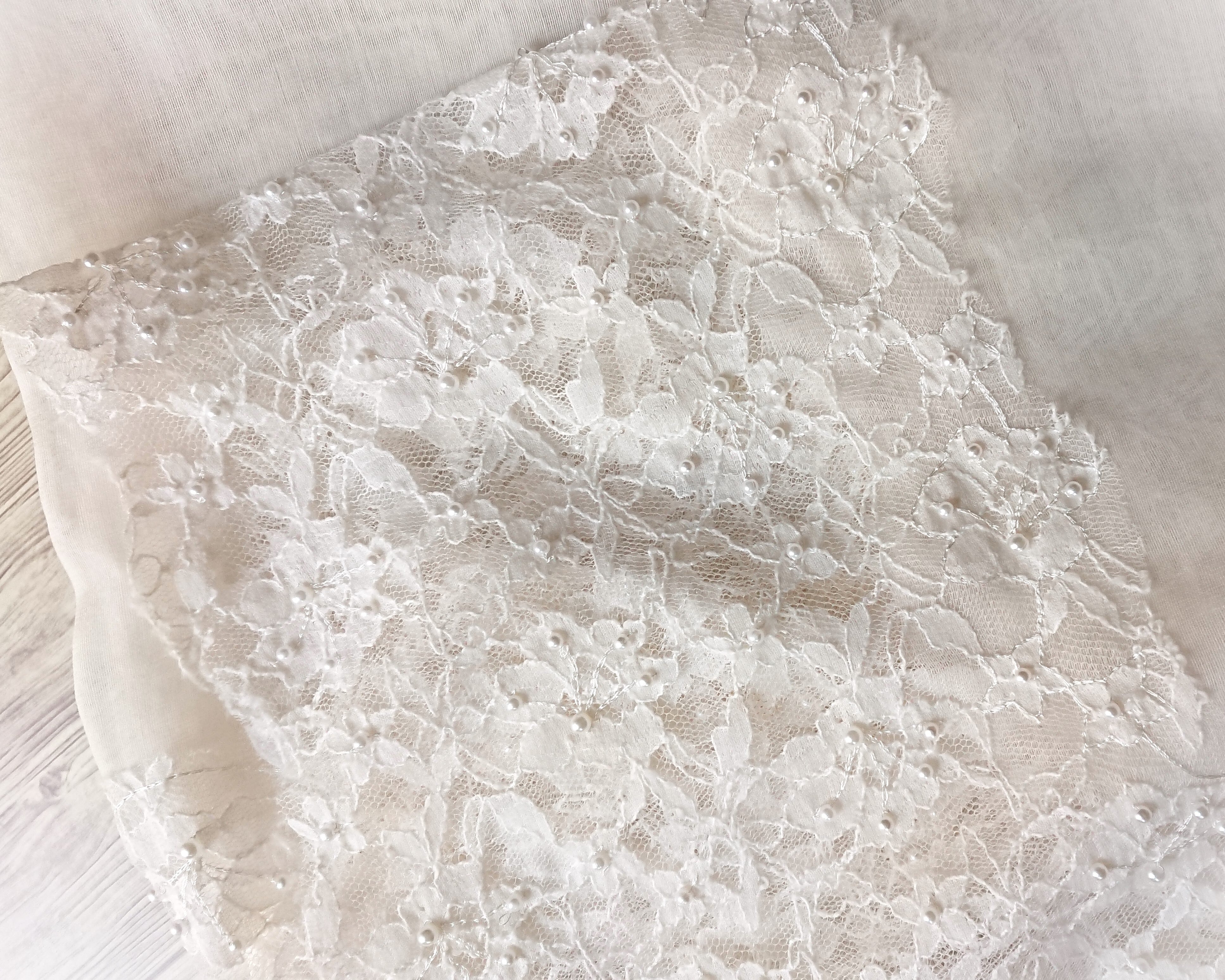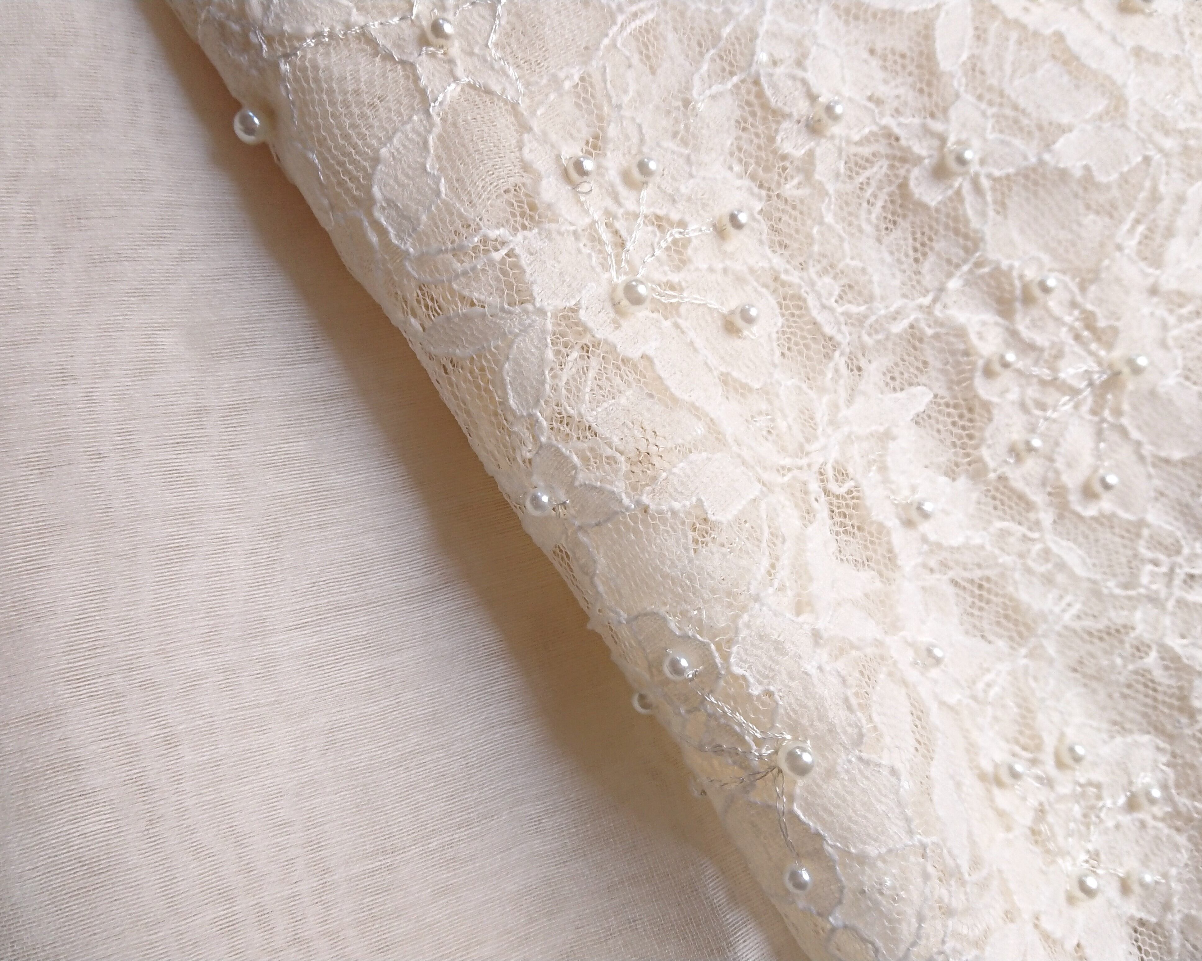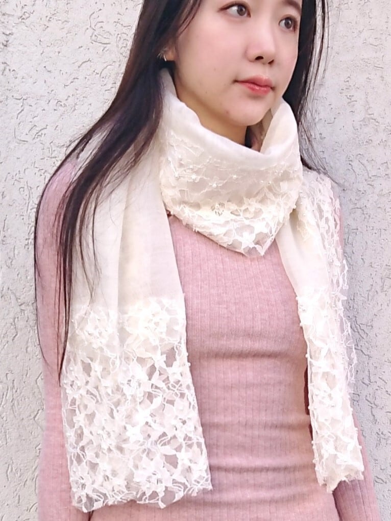 フェミニンで華やかなオフホワイトのレースにパールビーズがついたパーティーショールです。