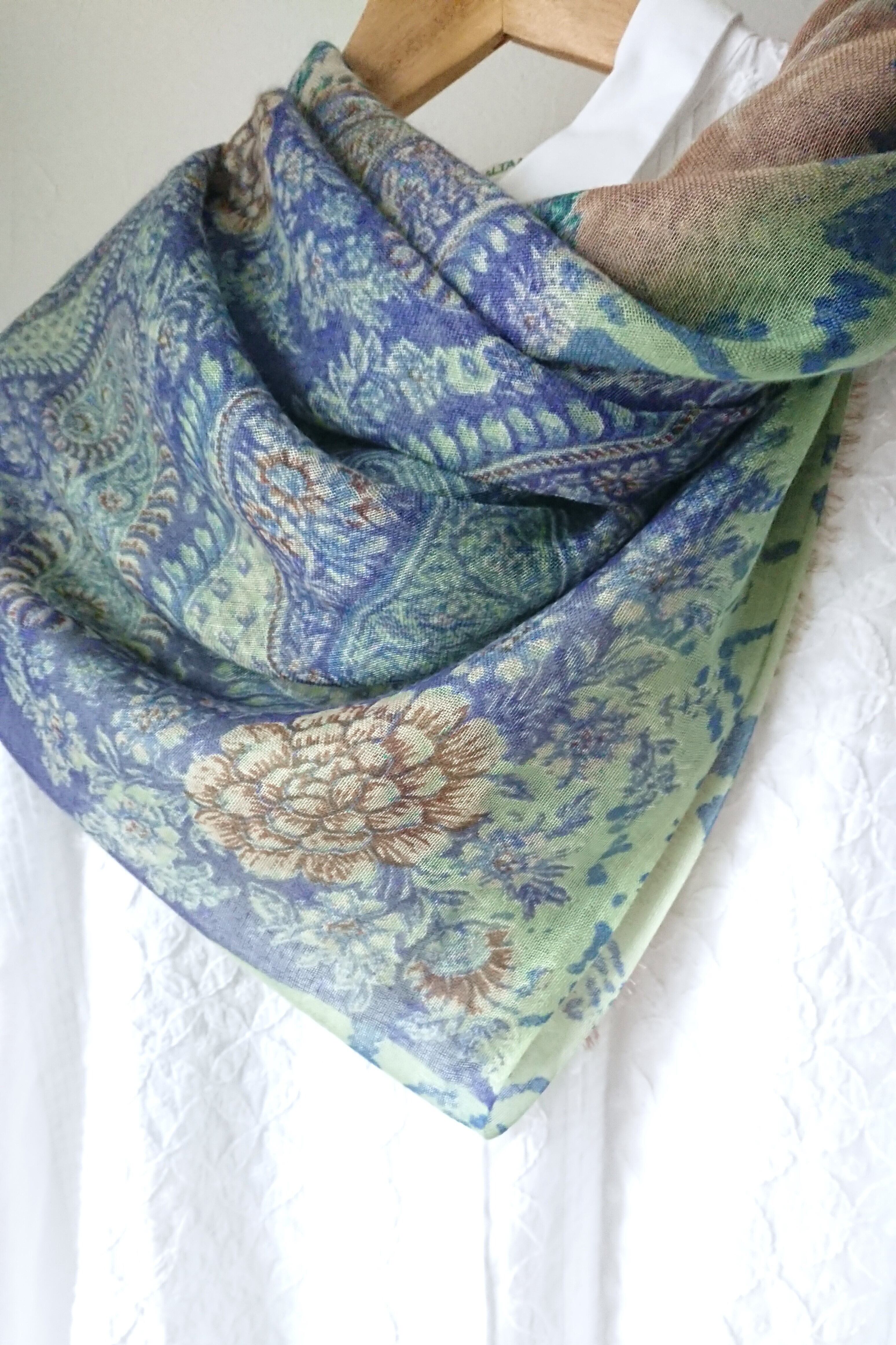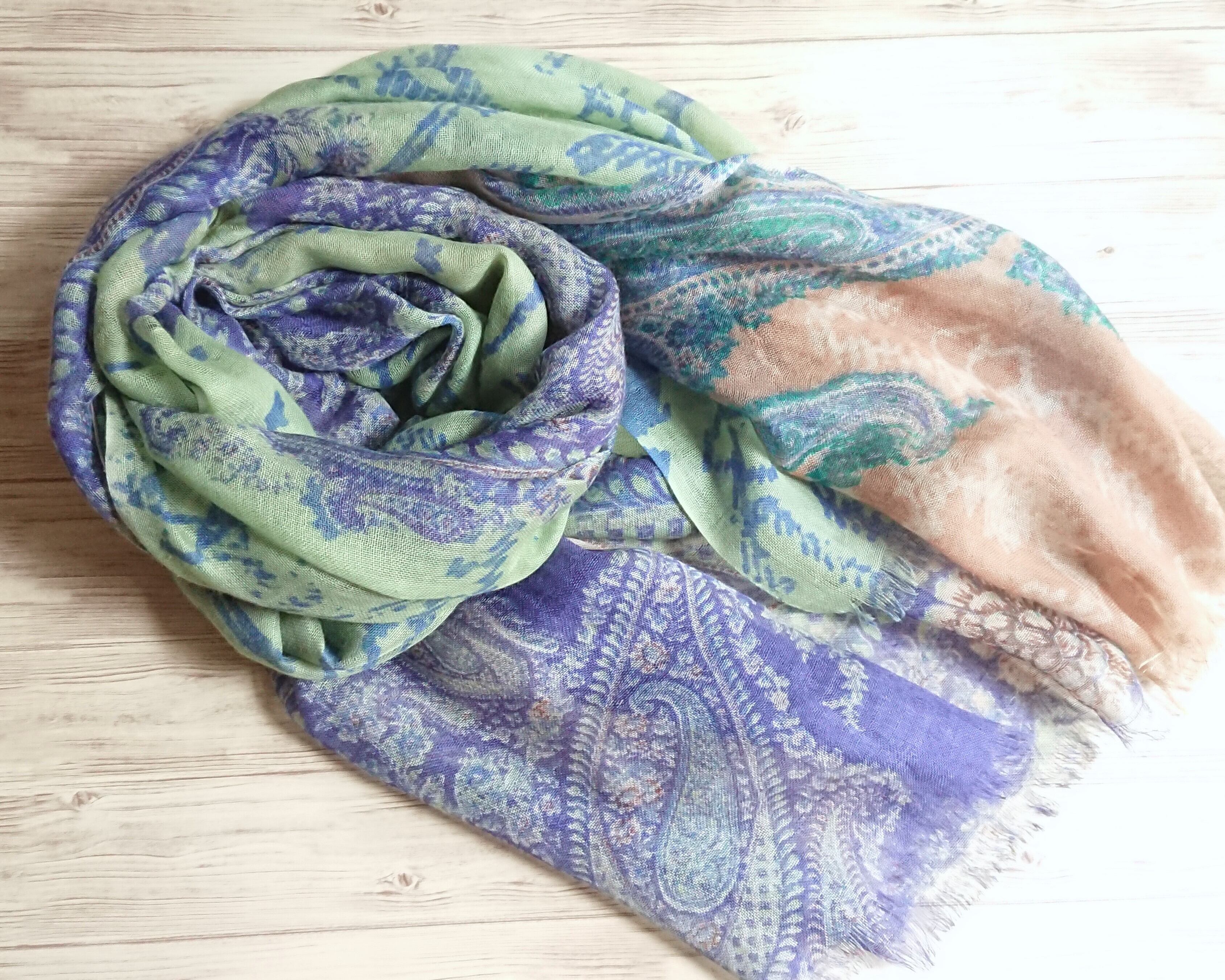 桔梗色と若草色のエレガントなペーズリー シルクカシミヤ