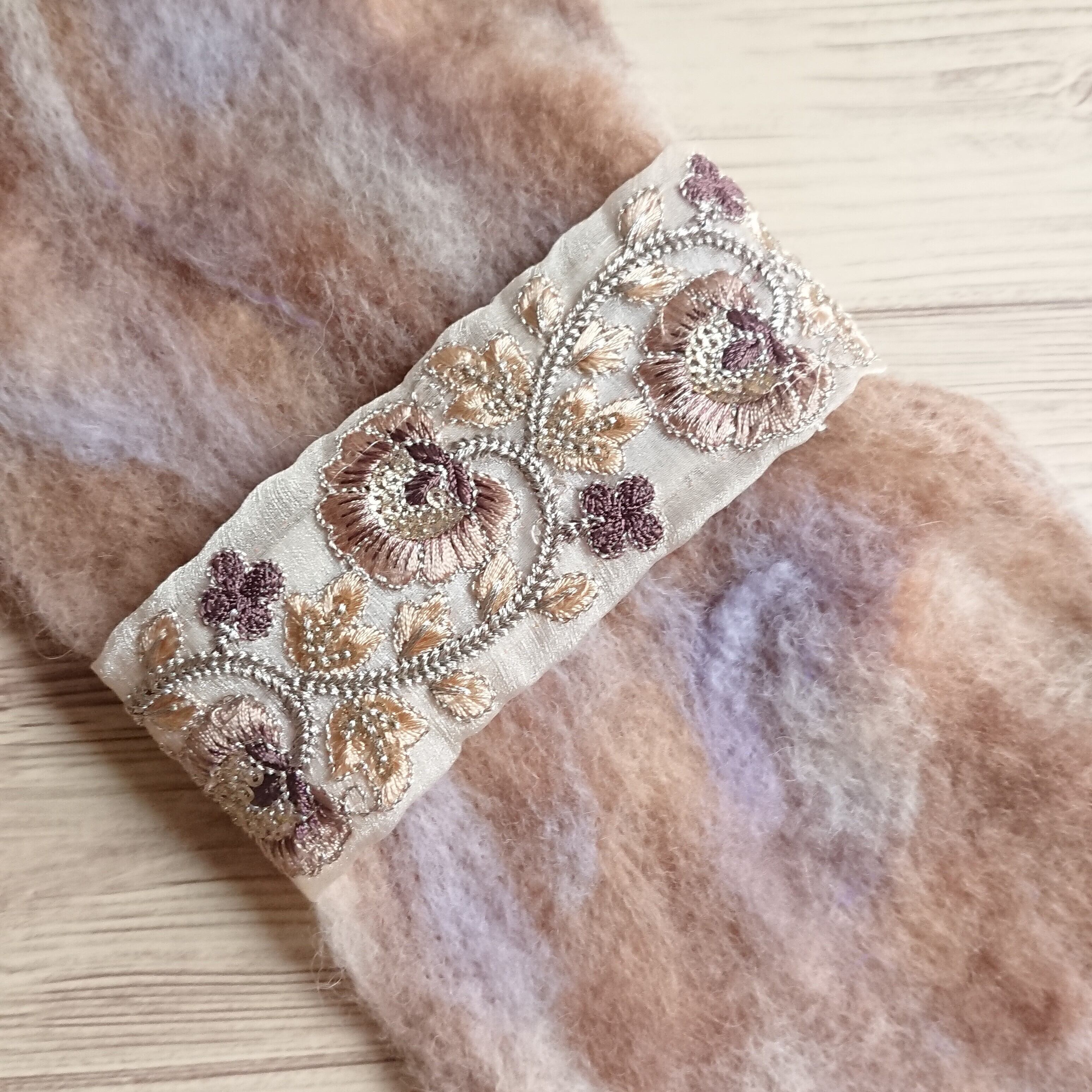 インド製の刺繍リボンに通して留める作りになっています。刺繍リボンは一部縫い付けてあり、2方向から通せるので、巻いた時の形を変えて楽しむことができます。