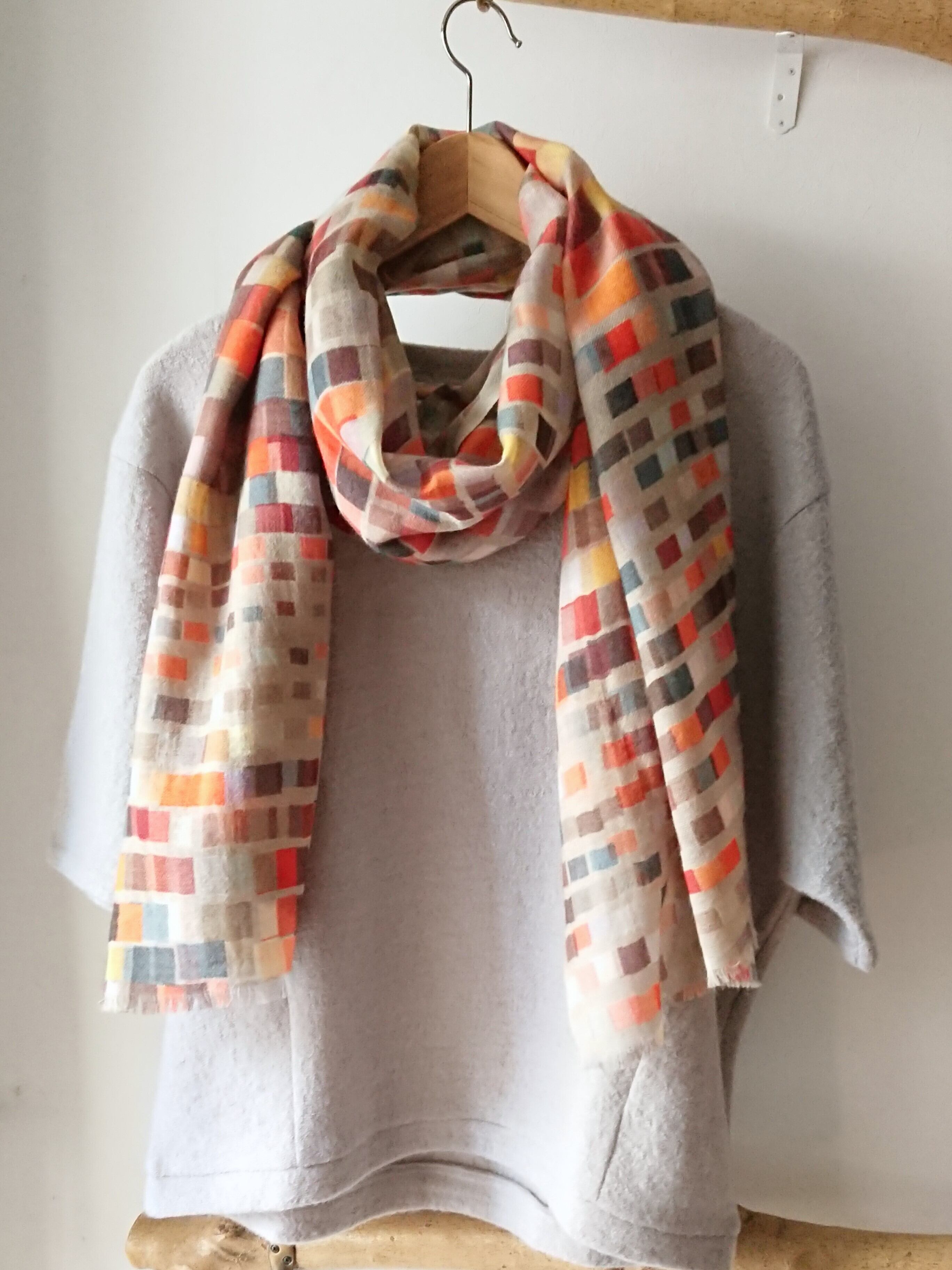 オレンジ系の色とりどりのブロックが並んだ個性的なプリントはとてもキレイな色合いで素敵です。