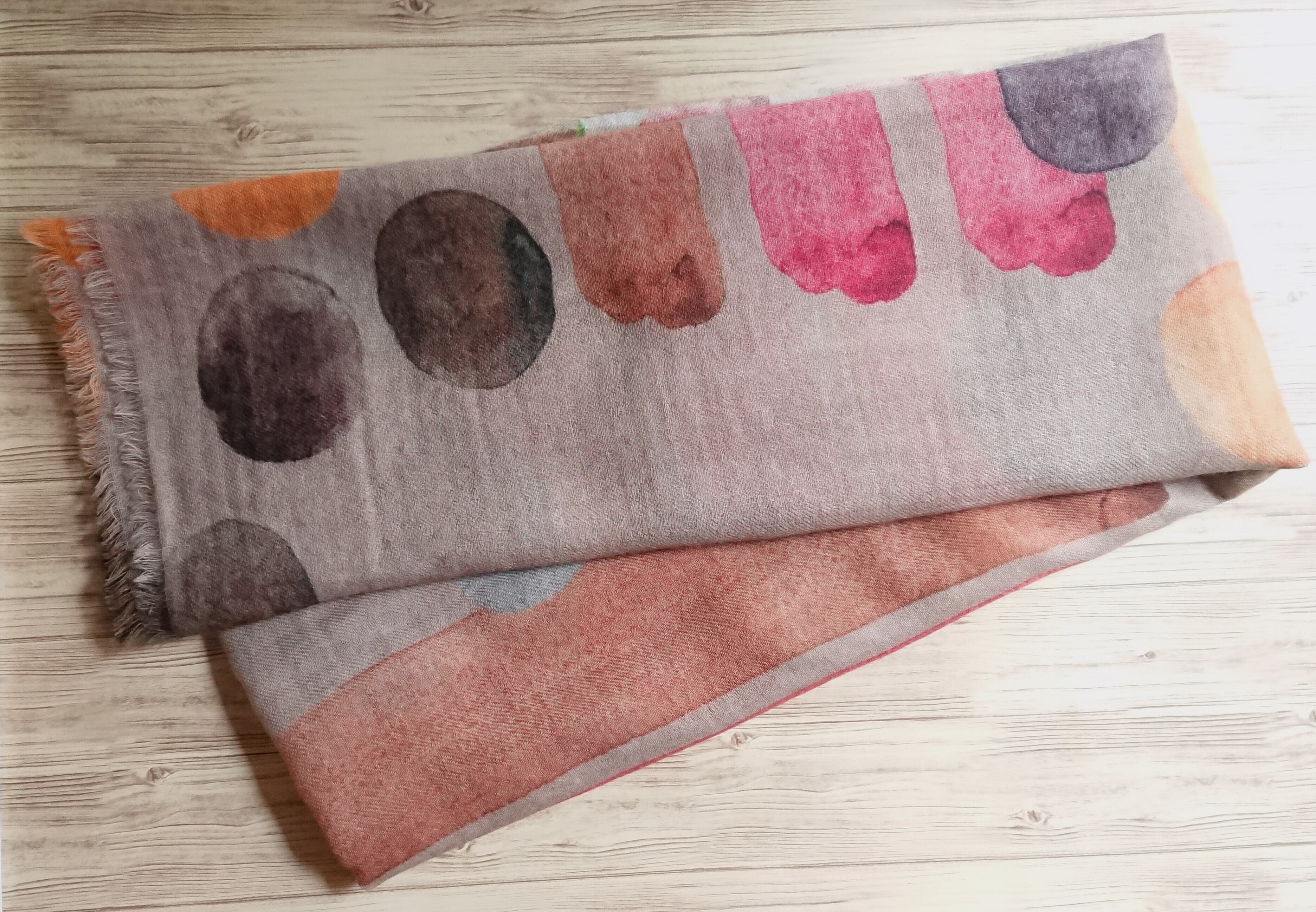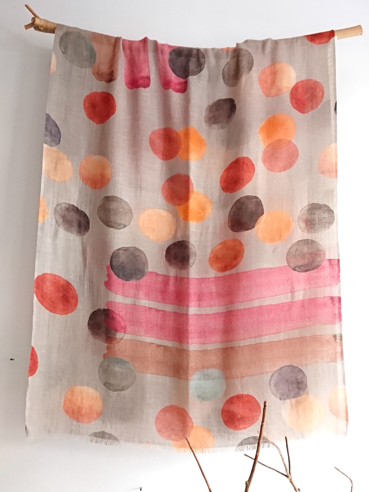 デジタルプリントならではの美しい色味で、つけていると楽しい気分になるような、そんなストールです。