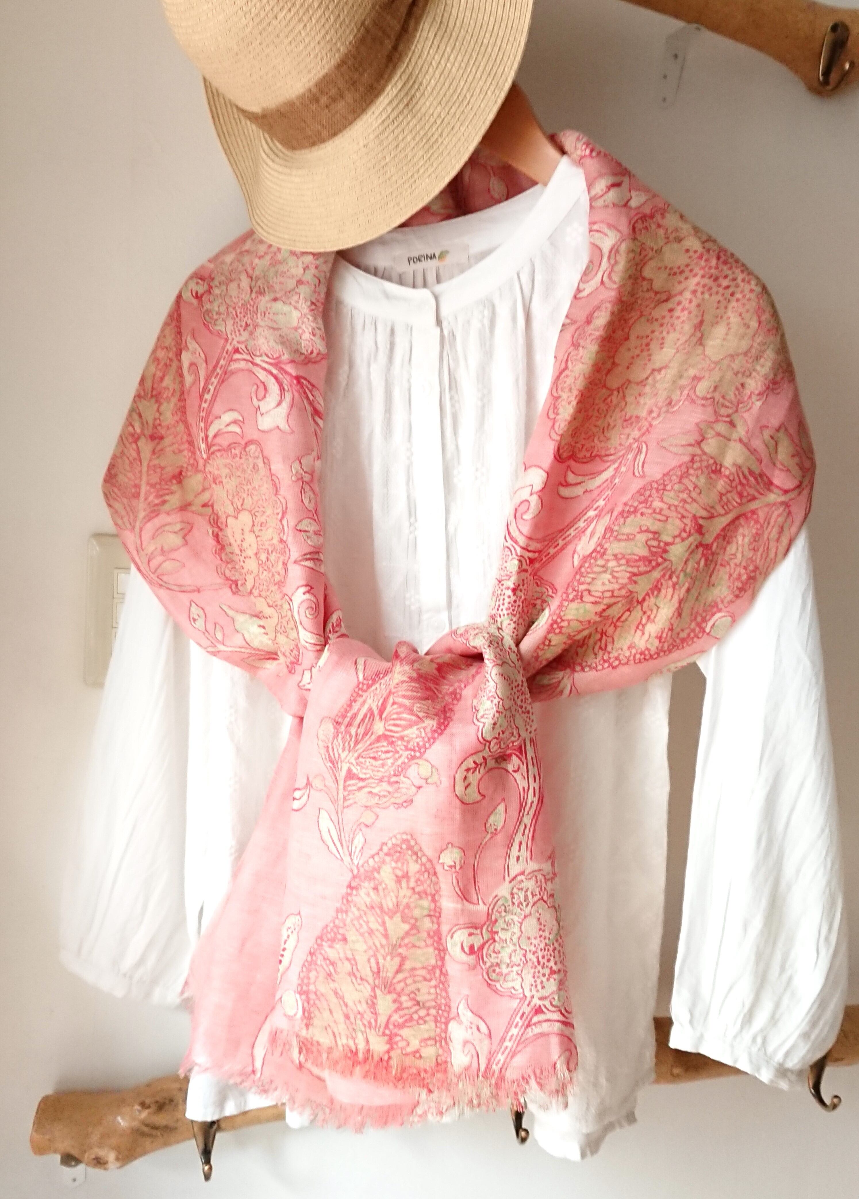 ピンクボタニカルのシルクリネンショールは、上品で華やかなアクセントになる一枚。