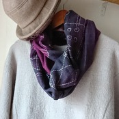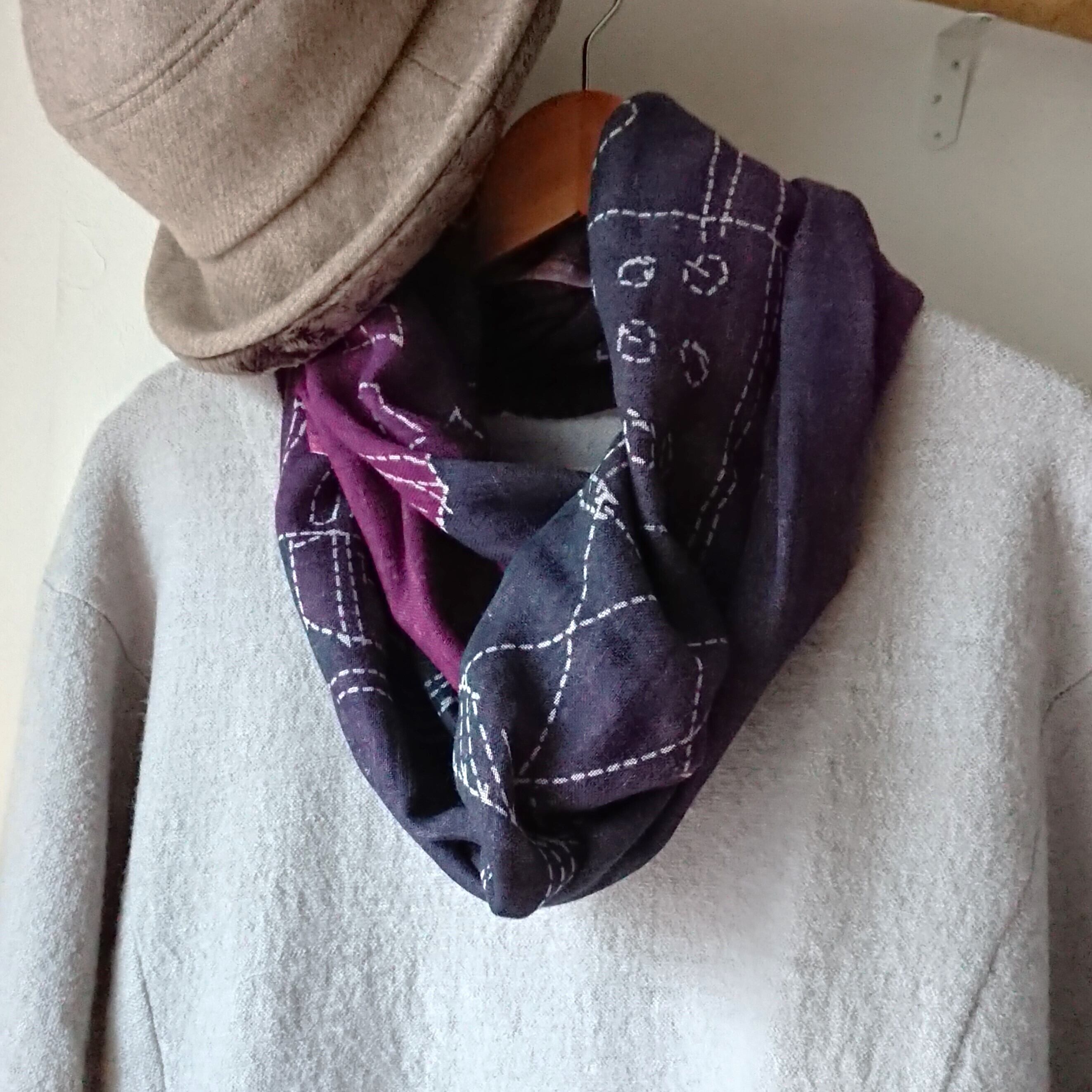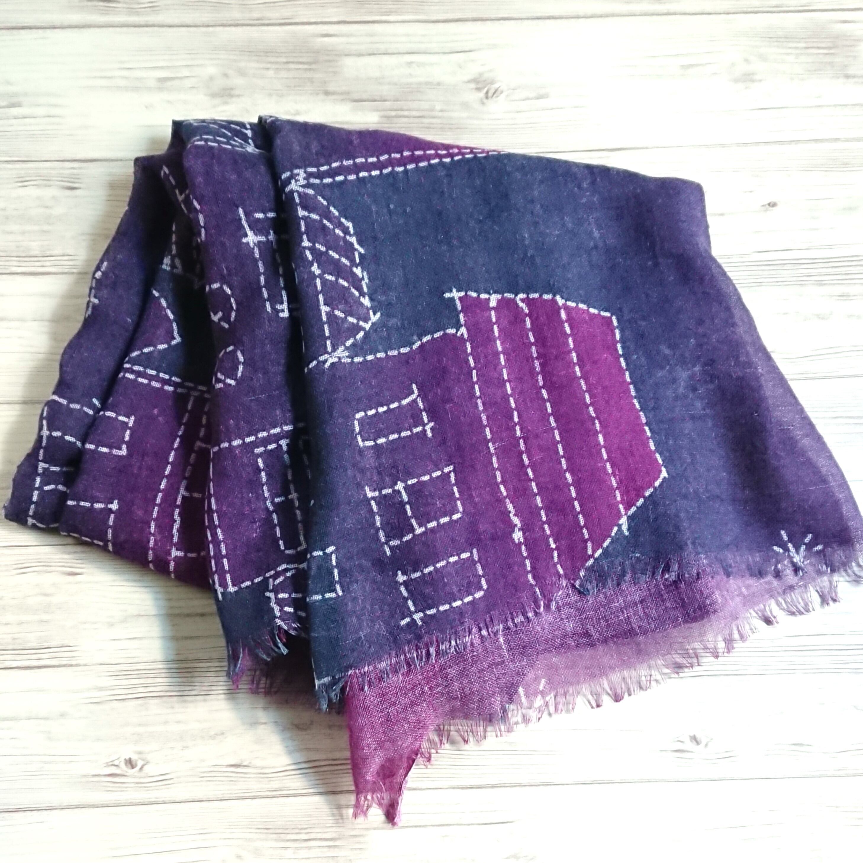 軽やかで薄いガーゼのようなカシュガル素材を使用しており、優れた肌触りと上品さを兼ね備えています。葡萄色のグラデーションが美しく、街並みをイメージしたステッチのようなプリントが施されています。デイリーユースでも特別なシーンでも幅広くお使いいただけます。